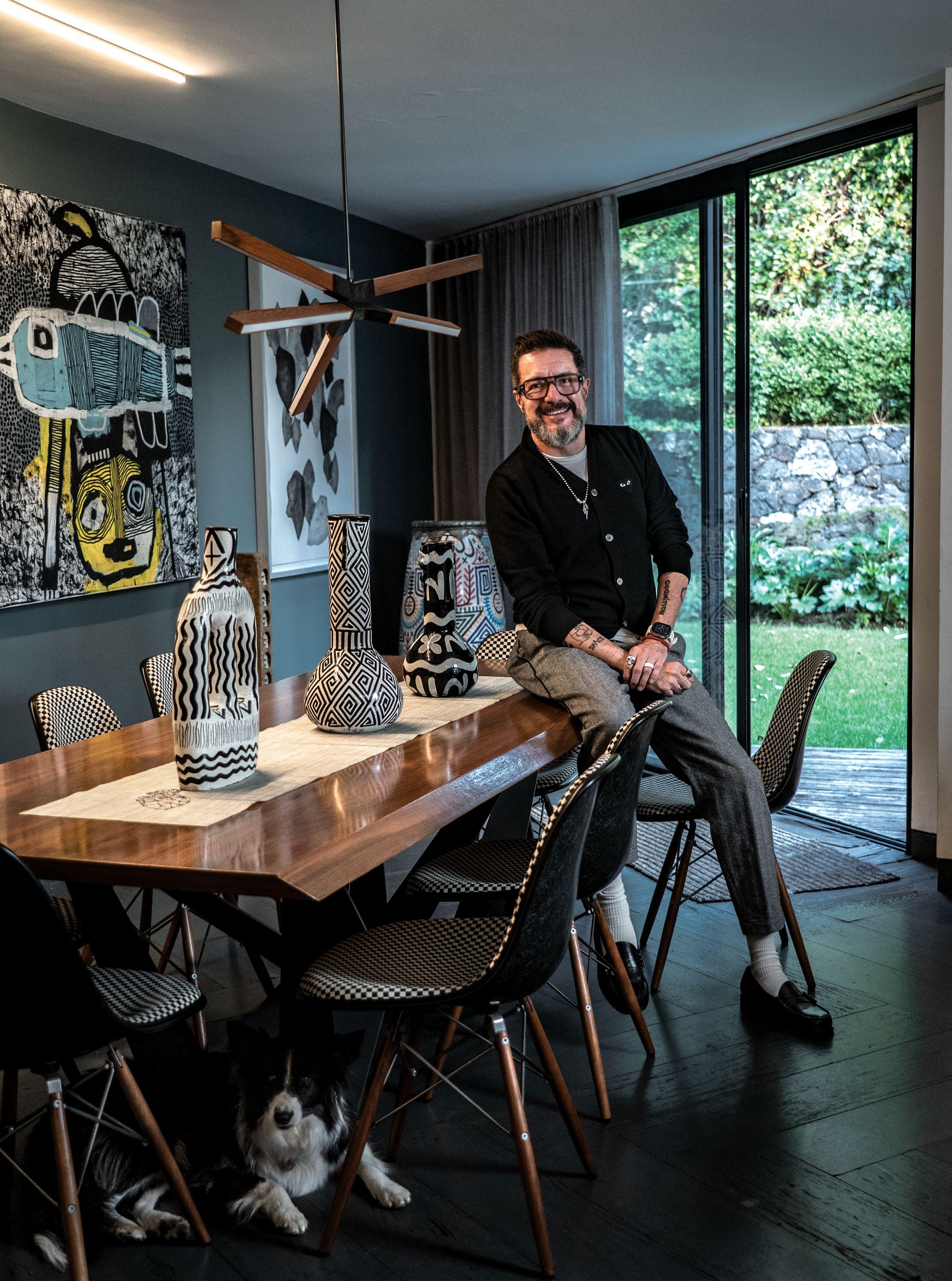 One of his favorite spaces is the study, lined with books and overlooking the garden, where an Eames lounge chair offers comfort for reading and work. Walls were removed to create openness, allowing the kitchen, dining room, and terrace to flow together. “It’s the place where I spend the most time,” he explains.