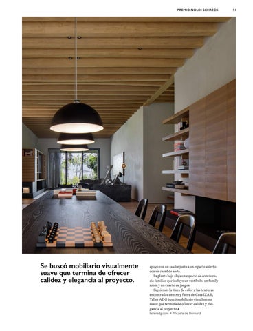apoyo con un asador junto a un espacio abierto con un carril de nado. La planta baja aloja un espacio de convivencia familiar que incluye un vestíbulo, un family room y un cuarto de juegos. Siguiendo la línea de color y las texturas encontradas dentro y fuera de Casa IZAR, Taller ADG buscó mobiliario visualmente suave que termina de ofrecer calidez y elegancia al proyecto. talleradg.com + Micaela de Bernardi