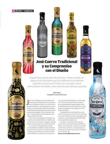 osé Cuervo Tradicional se ha caracterizado por la constante búsqueda de nuevos proyectos que impulsen el talento y la creatividad; un ejemplo evidente son las colaboraciones que ha tenido con los principales exponentes del arte y el diseño de nuestro país para intervenir las botellas de edición especial. A través de estos diseños, la marca refleja su esencia dinámica, innovadora y 100% mexicana. De la mancuerna lograda con Pineda Covalín nació una serie de botellas con diseños que se inspiraron en las largas y espigadas hojas del agave, y en el plumaje azul y verde del quetzal. En conjunto con Ezequiel Farca, realizaron tres botellas de edición limitada; las primeras dos fueron envueltas en una textura, gama cromática y geometría que remontan directamente a México: sus calles, las fachadas clási-