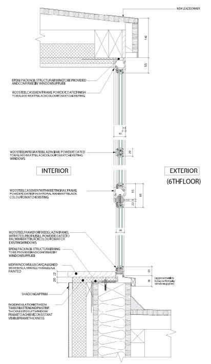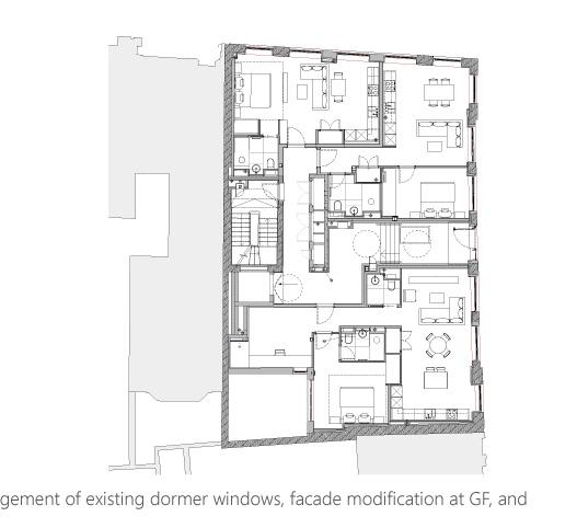 The building is situated in a Conservation Area and adjacent to a Grade II listed building. Therefore, the majority of the original facade is retained to be in keeping with the character of the surrounding context. The main construction works include: 1) the relocation of the central core, extension of the floor plate at the rear facade, and associated structural modifications to allow for more efficient use of floor space; 2) an upgrade to the building envelope and replacement of existing windows to meet the latest energy efficiency regulations; and 3) enlargement of window openings to provide the daylight and sunlight conditions required for residential use.