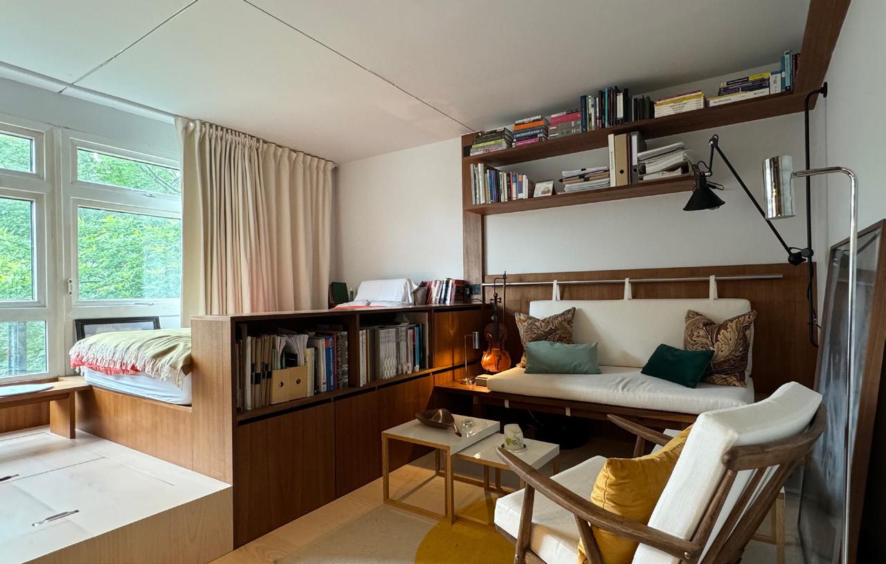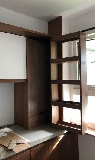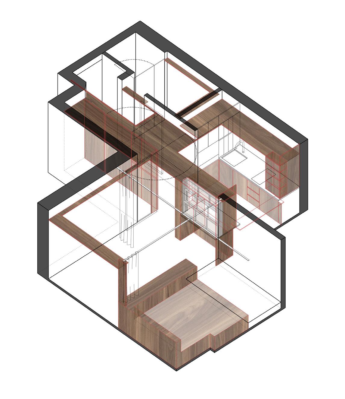 The underlying design explores the idea of our home as a place to accumulate and display the objects we have collected throughout our lives. The final design features a system of concealed and open shelving storage components, forming a joinery spine that unifies the flat into a giant Japanese puzzle box. The storage elements replace conventional walls to frame and define the different zones within the confines of this very small apartment.