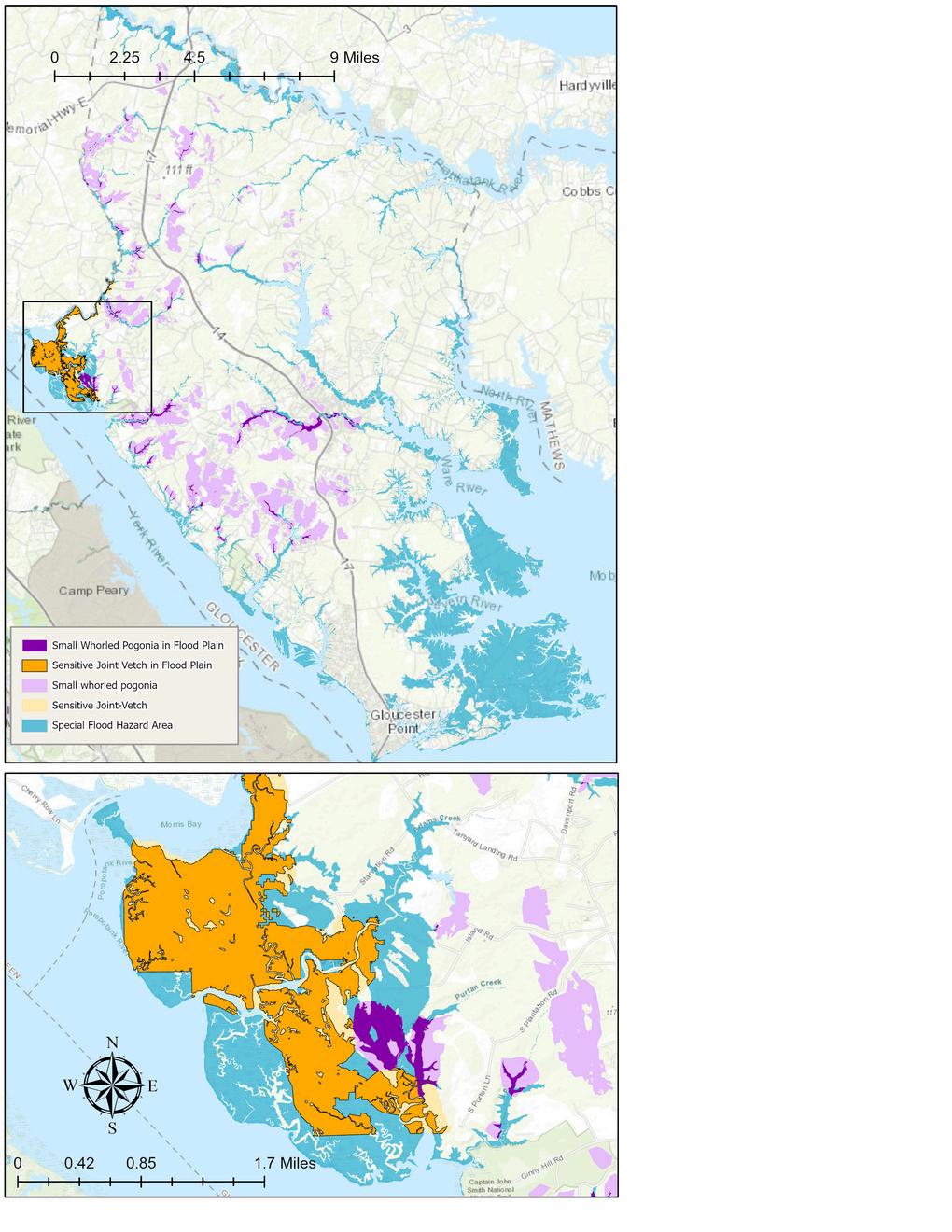 The Small Whorled Pogonia and Sensitive Joint Vetch are endangered species found in Gloucester County. These rare flowering plants may be found near waterways Protecting our natural floodplain functions includes protecting these species from extinction. For more information, please contact our local Virginia Ecological Services Office at 804-693-6694