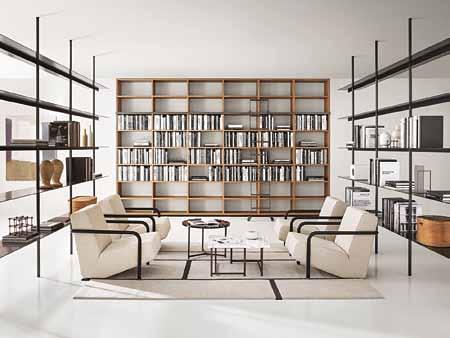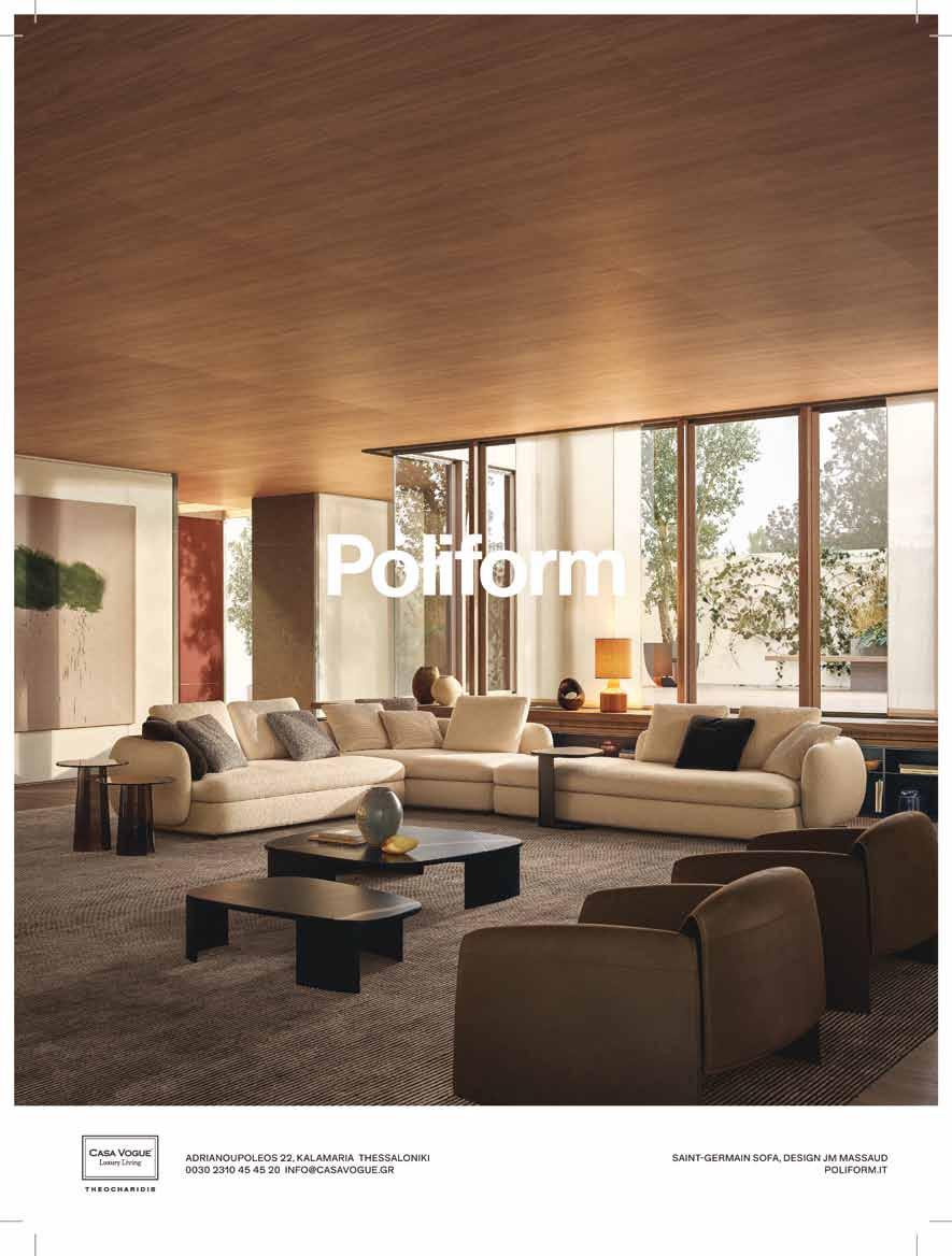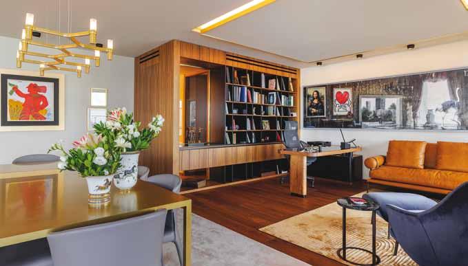 το καθιστικό απαρτίζεται από καναπέδες της minotti (moda Bagno Concept store) και τις δύο εμβληματικές δερμάτινες πολυθρόνες lC3 της Cassina (∆ελούδης). Φίνες επιλογές αντικειμένων και έργων τέχνης, όπως το γλυπτό του Λάππα (gallery Λόλα νικολάου), συμπληρώνουν τον χώρο με άποψη. ο χώρος του bespoke γραφείου με τη βιβλιοθήκη σχεδιάστηκε ειδικά και κατασκευάστηκε από τον Γιώργο αργυρόπουλο και βρίσκεται σε συνέχεια του ενιαίου χώρου. ο δερμάτινος καναπές της maxalto (∆ελούδης) και η πολυθρόνα της minotti (moda Bagno Concept store) συμπληρώνουν ιδανικά ένα εξαιρετικής αισθητικής σύνολο.