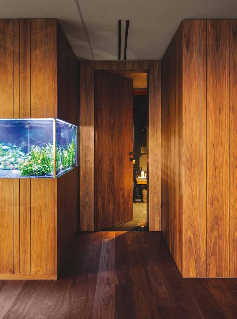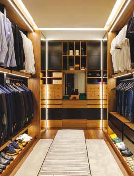τέτοια έκταση και δυναμική. Σε αυτόν τον χώρο, μια κεντρική νησίδα καταλήγει σε κυκλικό τραπέζι που περιτριγυρίζεται από τα “Air Swivel” stools (Moda Bagno Concept Store). Αντίστοιχα με το σαλόνι, η κουζίνα επεκτείνεται κι αυτή στο μπαλκόνι, όπου έχει διαμορφωθεί ένα υπαίθριο barbeque με κουζινάκι, καθιστικό και τραπέζι φαγητού. Μια σειρά από κατά παραγγελία κατασκευές από ξύλο καρυδιάς, που σχεδιάστηκαν από την αρχιτέκτονα και υλοποιήθηκαν από τον Γιώργο Αργυρόπουλο, στολίζουν το σπίτι με εντυπωσιακό τρόπο και του προσδίδουν εξαιρετική ποιότητα και αίσθηση υπεροχής. Μια πόρτα συνδέει το κυρίως διαμέρισμα με την ιδιωτική ζώνη του, όπου φιλοξενούνται τα υπνοδωμάτια και οι βοηθητικοί χώροι. Το master bedroom είναι το μοναδικό με θέα στην Παραλία και διαθέτει εκτός από δικό του μπάνιο κι ένα εντυπωσιακό dressing room, κατασκευασμένο ειδικά, ώστε να καλύπτει τις ανάγκες του ιδιοκτήτη. Εδώ κάθε λεπτομέρεια αποδεικνύει τόσο τον άριστο σχεδιασμό όσο και την custom made απόδοση στην κατασκευή. Άλλα δύο υπνοδωμάτια είναι διαμορφωμένα επίσης με GLOW LIVING winter 2022 146 G |home