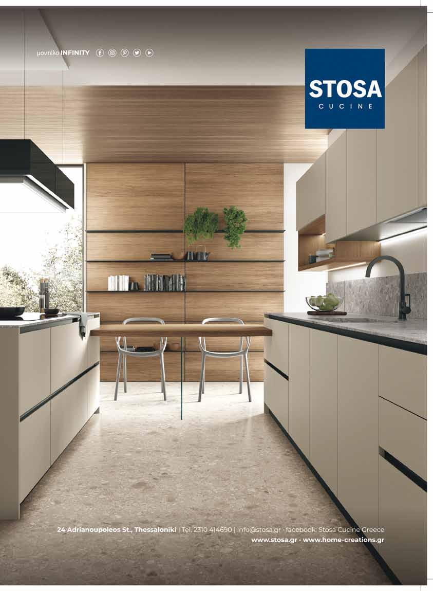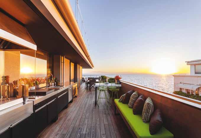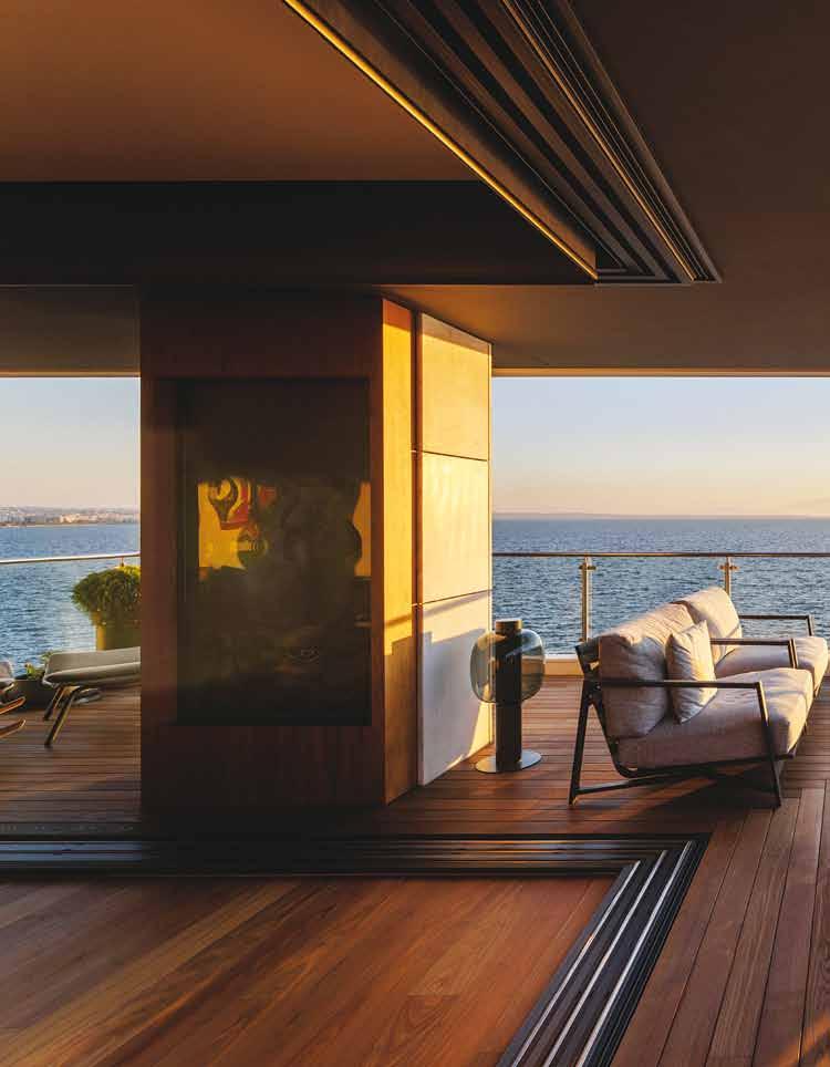 το. Μια ειδική κατασκευή επιτρέπει στα κουφώματα ν’ ανοίγουν απ’ άκρη σε άκρη, κάτι που χαρίζει στον χώρο μοναδική αίσθηση ελευθερίας, καθώς το μέσα με το έξω περιβάλλον ενώνονται με πολύ ιδιαίτερο τρόπο. Η άνετη βεράντα έχει «ντυθεί» με το ίδιο ξύλινο δάπεδο που υπάρχει και στο εσωτερικό, λειτουργώντας ως φυσική συνέχειά του, και είναι διακοσμημένη με εξαιρετικές επιλογές επίπλων (Moda Bagno Concept Store). Αυτή απολαμβάνει το μεγαλύτερο