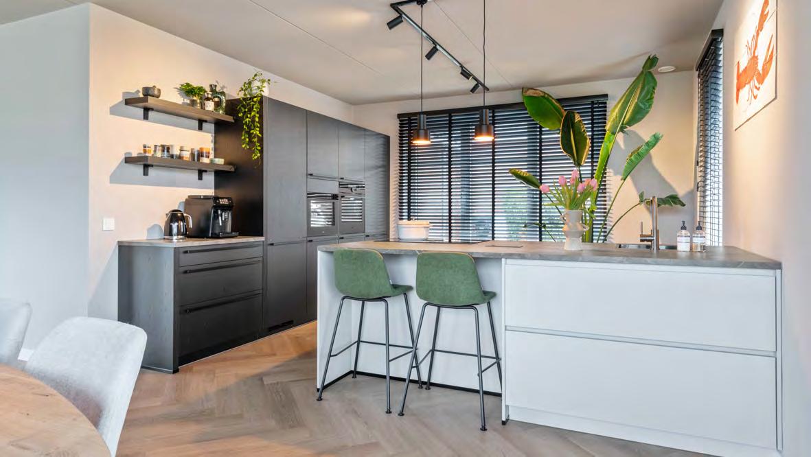 Compleet met: oven, inductiekookplaat met geïntegreerde afzuiging, koelkast, vaatwasser, wijnklimaatkast, keramiek werkblad, spoelbak en 5 jaar apparatuurgarantie