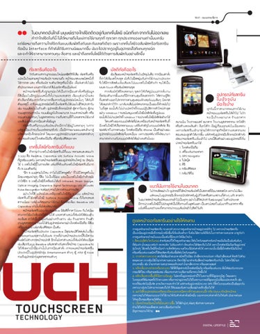 งานอุตสาหกรรม รวมทัง้ ใช้กบั อุปกรณ์พกพาอย่างโทรศัพท์มอื ถือ พีดเี อ เครือ่ งเล่นเกม และกล้องดิจติ อล เป็นต้น หน้าจอทัชสกรีนประเภท Capacitive มีคณ ุ สมบัตโิ ดดเด่นในเรือ่ ง ความทนทานและความโปร่งแสง ภาพทีผ่ า่ นหน้าจอประเภทนีจ้ งึ มีความ คมชัดไม่ตา่ งจากหน้าจอปกติ อีกทัง้ ยังหาตำแหน่งทีส่ มั ผัสได้ละเอียด