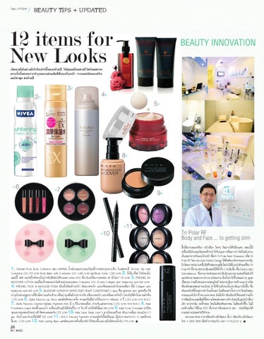 1. Oriental Rose Body Collection ของ HARNN น�้ำมันหอมระเหยบริสุทธิ์จากดอกกุหลาบจีน ในเซตจะมี Shower Gel with Coenzyme Q10 720 บาท Body Balm with Coenzyme Q10 1,450 บาท และBody Scrub 1,350 บาท 2. นีเวีย ดีโอ ไวท์เทนนิง่ แฮปปี้ เชฟ สเปรย์ไวท์เทนนิง่ ส�ำหรับฉีดพ่นใต้วงแขน ผสม ACH ที่ระงับเหงื่อนานตลอด 48 ชั่วโมง* 99 บาท 3. FRESHEL EX MOISTURE LOTION ลดเลือนริ้วรอยแห่งวัยด้วยส่วนผสมของ Coenzyme Q10, Double Collagen และ Hyaluronic acid 540 บาท 4. FRESHEL PACK & MASSAGE FOAM เป็นทั้งโฟมล้างหน้า โฟมนวดหน้า และครีมพอกหน้าในขวดเดียว ที่มี Collagen และ Hyaluronic acid 490 บาท 5. BLANCHIR SUPERIOR WHITE DEEP NIGHT CONDITIONER 2 แบบ คือ สูตรเจล และ สูตรครีม ใช้ บ�ำรุงในช่วงฤดูหนาวทีผ่ วิ มีความแห้งกร้าน ครีมบ�ำรุงเพือ่ ผิวกระจ่างใส ครีมนวดหน้า และครีมมาสก์หน้า ปรนนิบตั ผิ วิ ในยามค�ำ่ คืน 1,700 บาท 6. Guilty Passions Lip Gloss เมคอัพคิทขนาดจิ๋ว ตกแต่งริมฝีปากให้แวววาว กล่องละ 4 สี 2,200 บาท จาก M.A.C 7. Guilty Passions Crushed Metalic Pigments Kits มี 4 สีในกล่องเดียว ส�ำหรับแต่งตาสวย 2,200 บาท จาก M.A.C 8. Kate Powderless Liquid รองพื้นแบบน�้ำ เปลี่ยนเป็นแป้งได้ทันทีใน 15 วินาที ปกปิดดีเยี่ยม 640 บาท 9. Kate Cover Concealer ปกปิด จุดและรอยของผิวอย่างดี ติดทนตลอดวัน 330 บาท 10. Kate Super Sharp Liner S อายไลเนอร์ใหม่ เส้นบางเฉียบ ขนแปรง 0.3 มม. กันน�ำ้ และกันเหงื่อได้ดี 290 บาท 11. M.A.C Pressed Pigments อายแชโดว์เนื้อครีมนุ่ม มีประกายแวววาว 12 เฉดสีสวย ชิ้นละ 1,300 บาท 12. Kate Lasting Base เมคอัพเบสทาครั้งเดียวก็ท�ำให้รองพื้นและแป้งติดทนทั้งวัน 375 บาท 26 W + MAG .