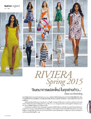 แสงอาทิตย์เปล่งประกายบนหาดทรายขาวของ Coôte d’Azur หญิงสาวก�าลังเริงร่าในชุดลายตารางกับกระโปรงชีฟองสีสันสดใส ปล่อย อารมณ์พลิ้วไหวไปกับสายลมที่พัดผ่าน มีงานศิลปะไล่โทนสีขาวด�าเป็นฉากหลังให้สาวน้อยได้เริงร่า เต้นระบ�าดื่มด�่าไปกับบรรยากาศ ทะเลสีคราม เธอเดินทอดน่องอิ่มเอมไปกับบรรยากาศแห่งท้องทะเล จากวันสู่คืน ในชุดคลุมอาบน�า้ สีขาวและกางเกงขาสั้นง่ายๆ คั่นด้วยกระเป๋าลายดอก สะดุดตา ใส่ท็อปบรากับกระโปรงทรงป๊อปลิน มีผ้าไหมลายกราฟิก Toile de Jouy สีชมพูและเขียวเพิ่มความสดใสแลดูเข้าถึงงานศิลปะของ Picasso และ Matisse เธอคือผู้เข้าใจศิลปะแห่งการใช้ชีวิตอย่างแท้จริง ขณะทีเ่ ธอย่อเข่าชมพุม่ เฟือ่ งฟ้า ฝันกลางวันของเธอถูกถ่ายทอดออกมาเป็นสีฟา้ ใส สีสม้ แสด และสีเหลืองทองบนเล็บเท้าทัง้ สองข้างทีเ่ ผยออกมา จากรองเท้าแตะสานลายตาราง เธอในชุดชีฟองพิมพ์ลาย สวมเสือ้ คลุม แหงนหน้ามองท้องฟ้า และหันตามก้อนเมฆสีขาวดัง่ ปุยนุน่ ในสวน Eden Garden ที่เคลื่อนผ่าน ล่องลอยไปถึงดวงจันทร์ท่ามกลางแสงดาววิบวับในเชิ้ตเดรส เธอกรายยิ้มพร้อมขยิบตา ราวกับรู้ว่าจุดหมายปลายทางของเธอในการ ท่องเที่ยวผจญภัยครั้งต่อไปอยู่ที่ไหน 46