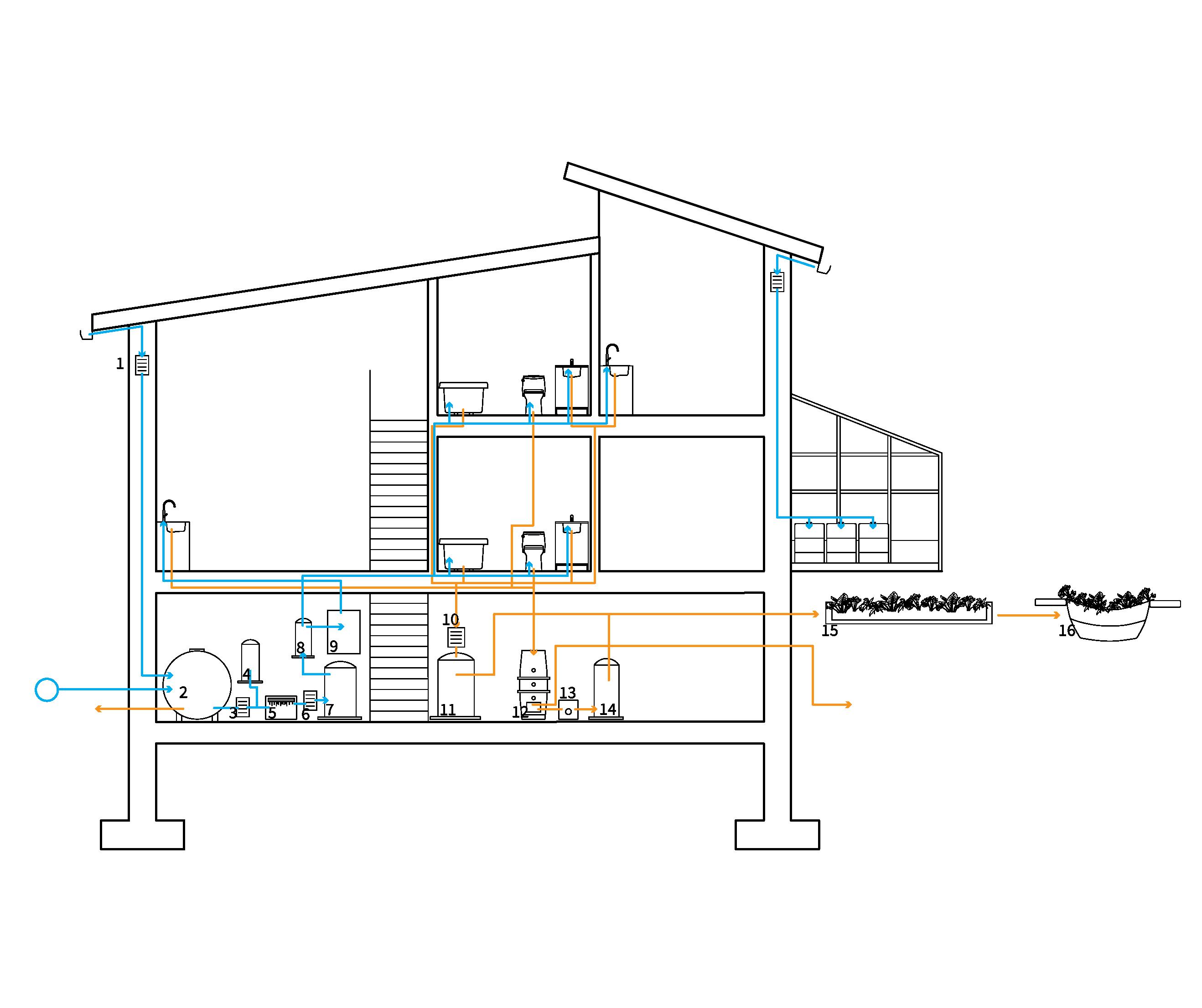 Potable water tank 8 Pressure Tank 9 Solar pump & controls 10 Filter 11 Greywater tank