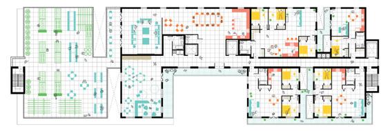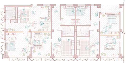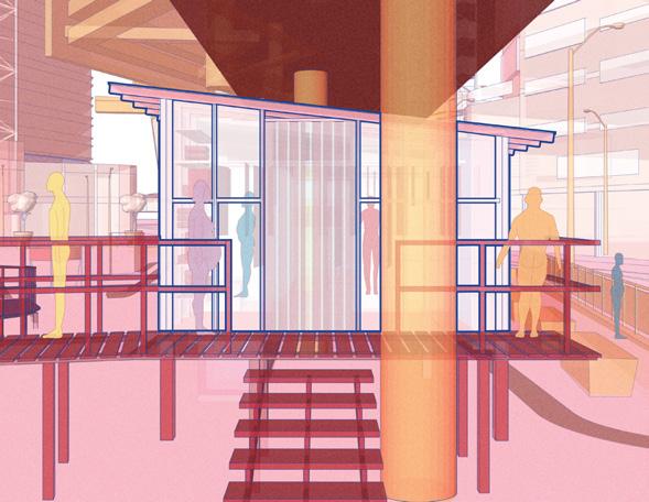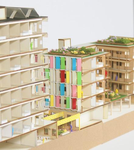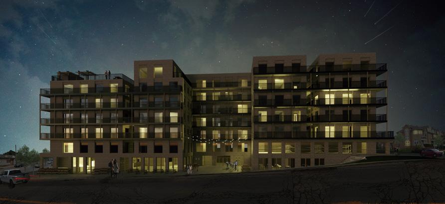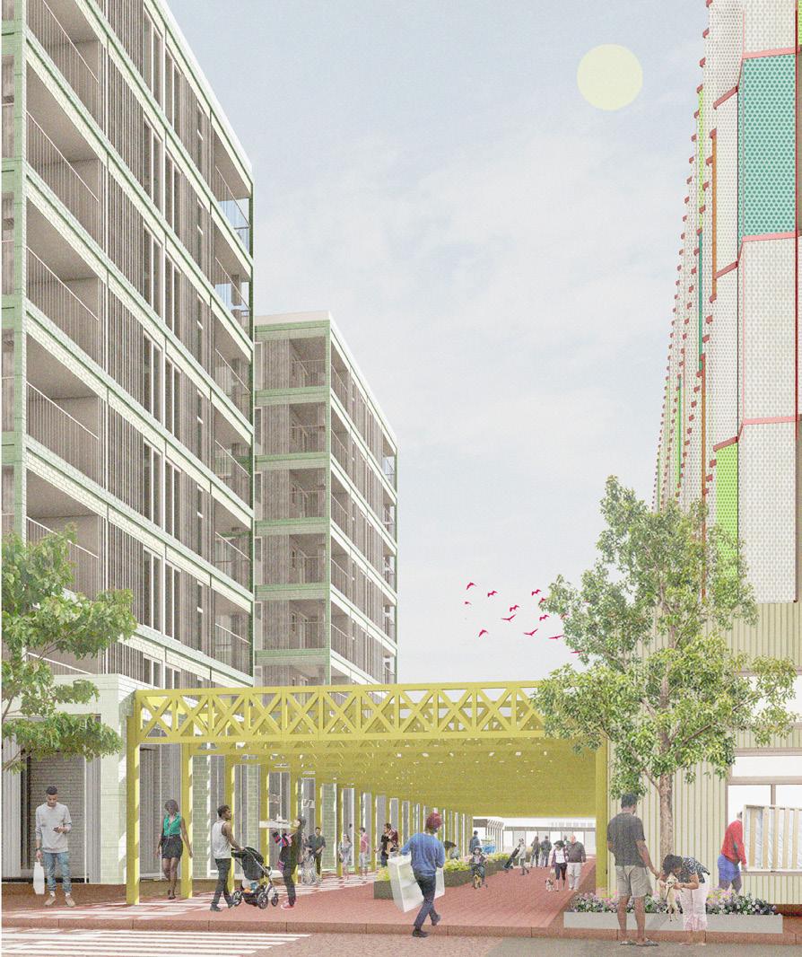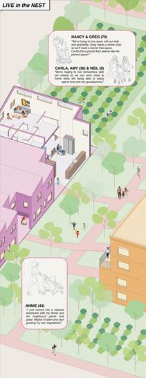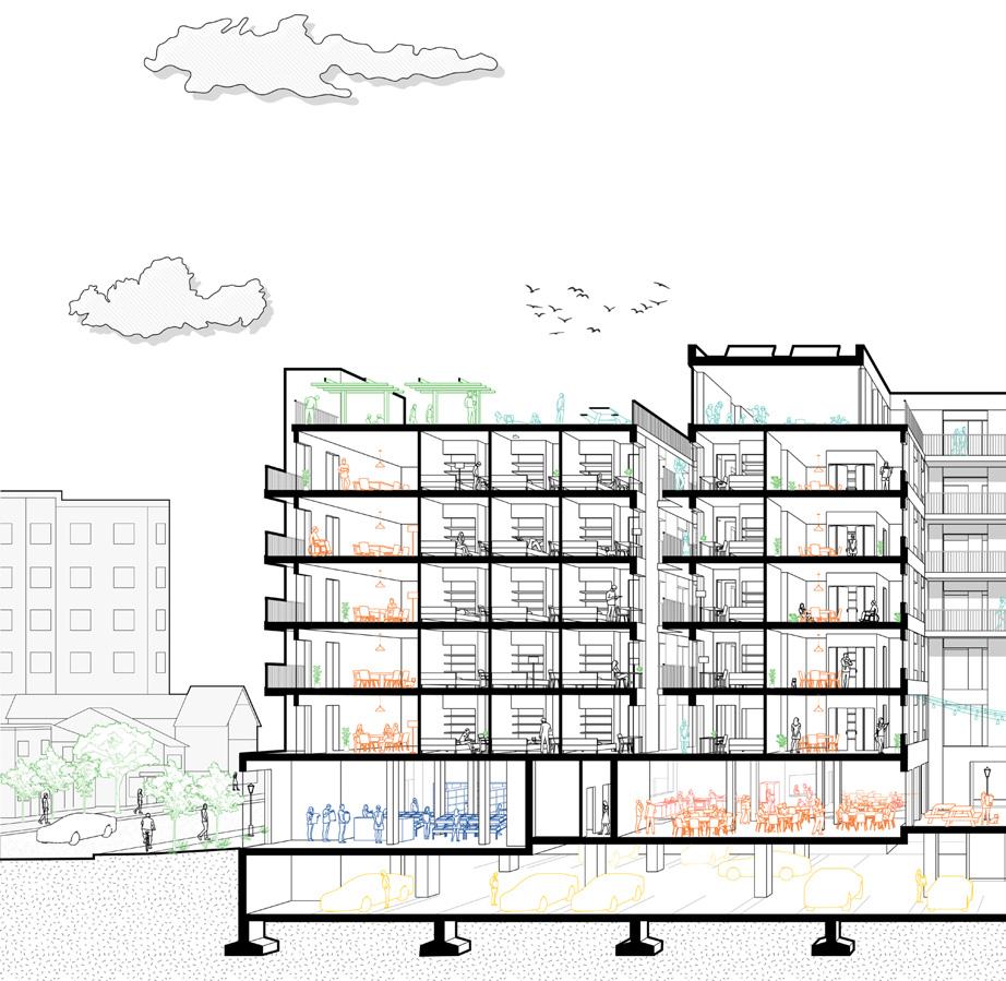 The typologies of the NEST features designed spaces such as communal kitchens, large community gardens, and optimized orientation for natural lighting to build intentional communities within each housing complex. Situated closest to the suburbs north of the site, the NEST provides the social benefits of living collectively while creating a sense of safety and privacy.