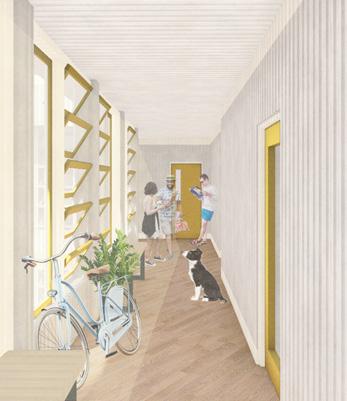 To provide affordable housing, Cambridge CoHousing offers various unit types as well as a spectrum of unit furnishings. Occupants are given the opportunity and agency to design their space for their particular needs, as well as simply rent and live in a pre-designed unit. In addition, each unit provides the space to expand for the number of people housed.