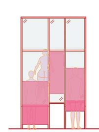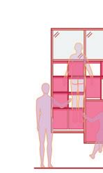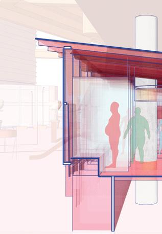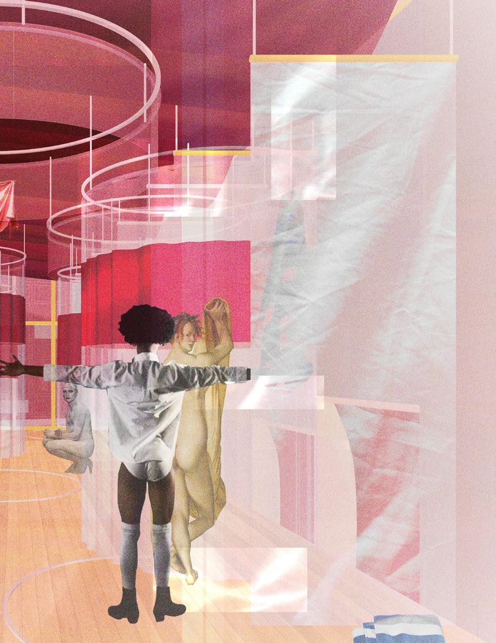 The change room intervention primary feature is a veiled material that is used throughout the building to encourage interaction, whether it be directly person-person or over time through mutual aid. This manifests as collaborative change room curtains, mutual aid closet + shelves, fabric seating and tug-of-war change rooms.