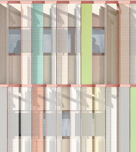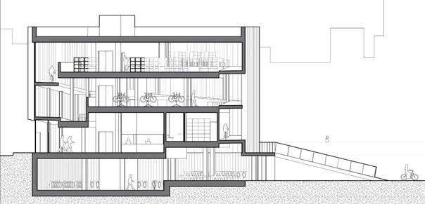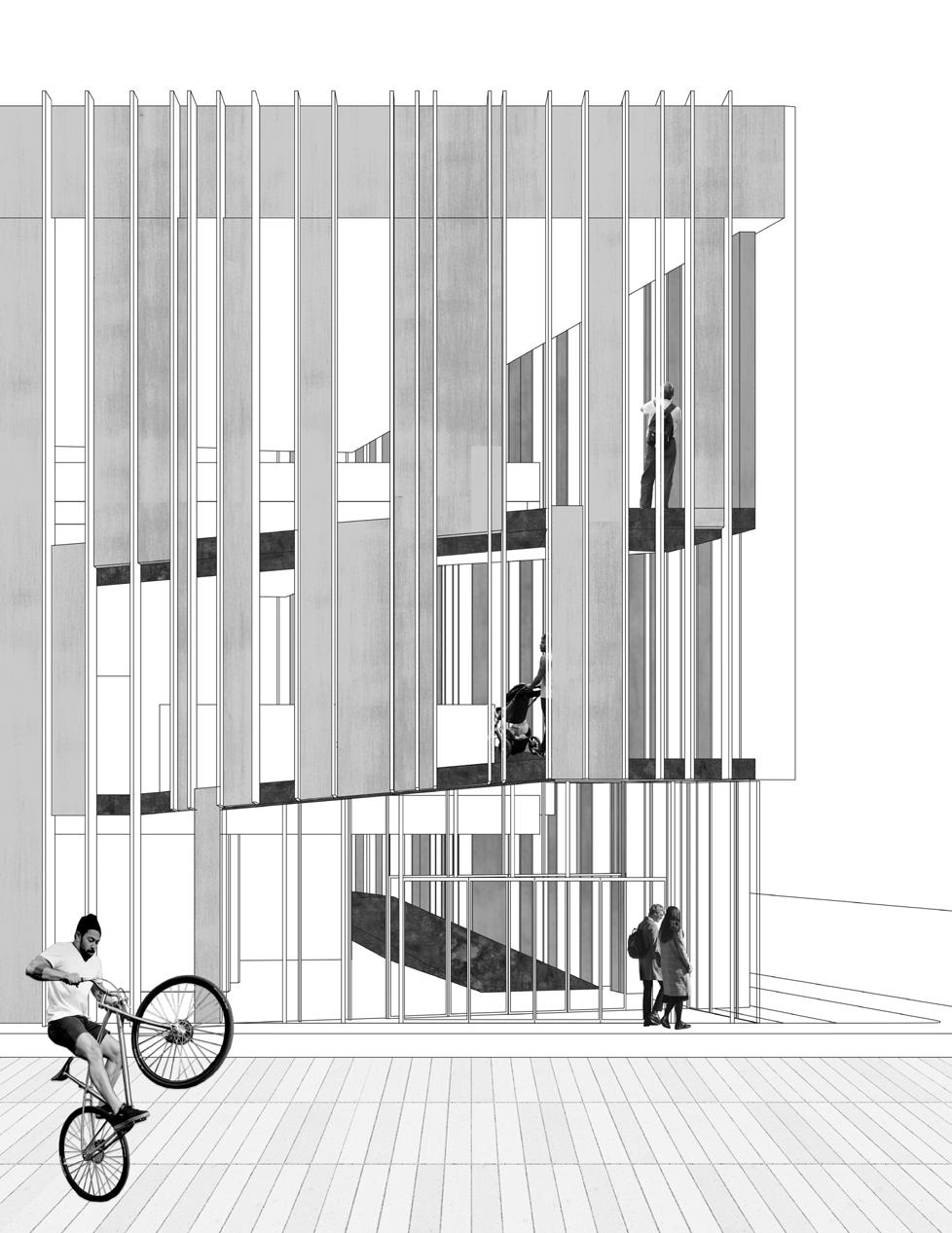 The facade detail is based on a ‘vitruvian bike’ in which the vertical fin arrangement is based on the proportions of a standard bike.