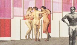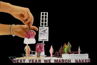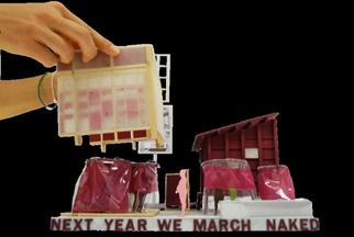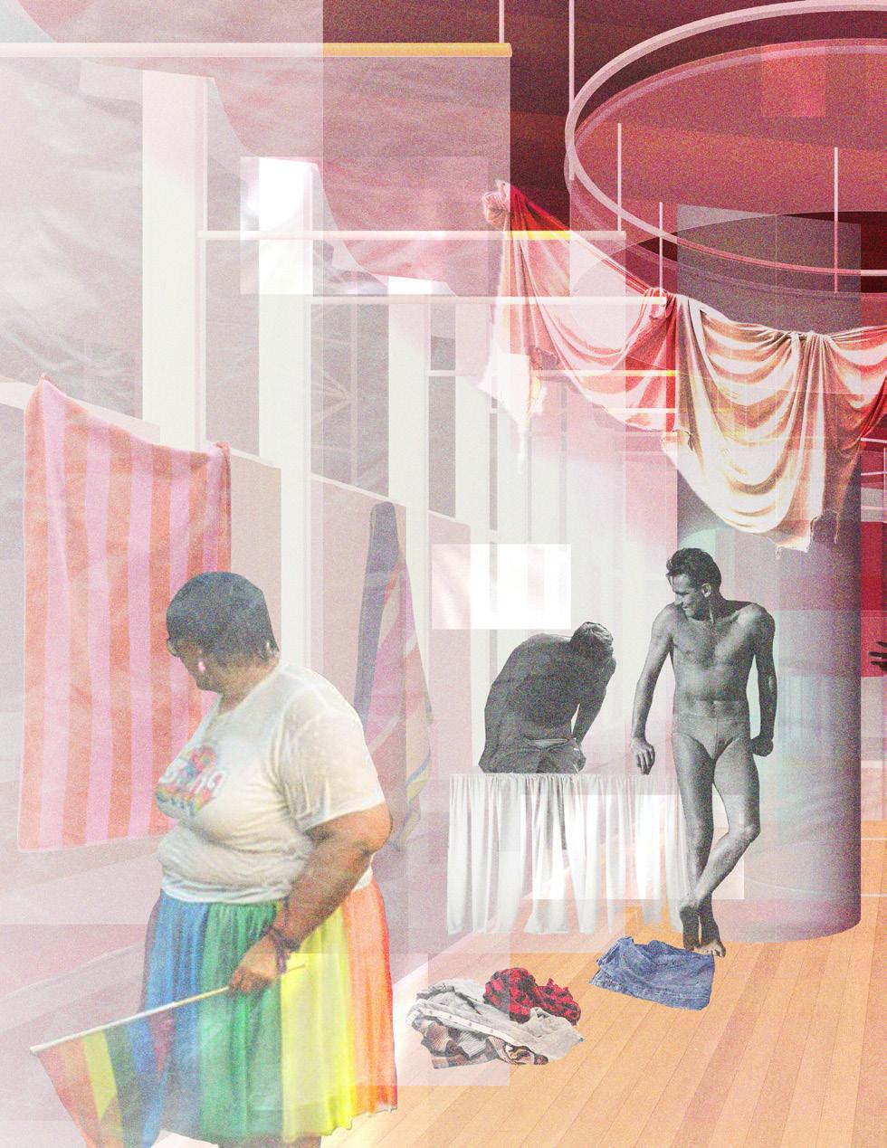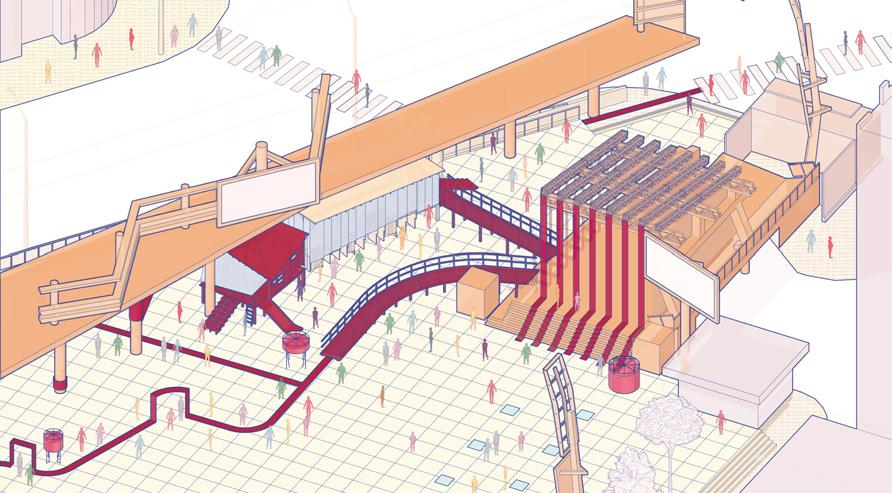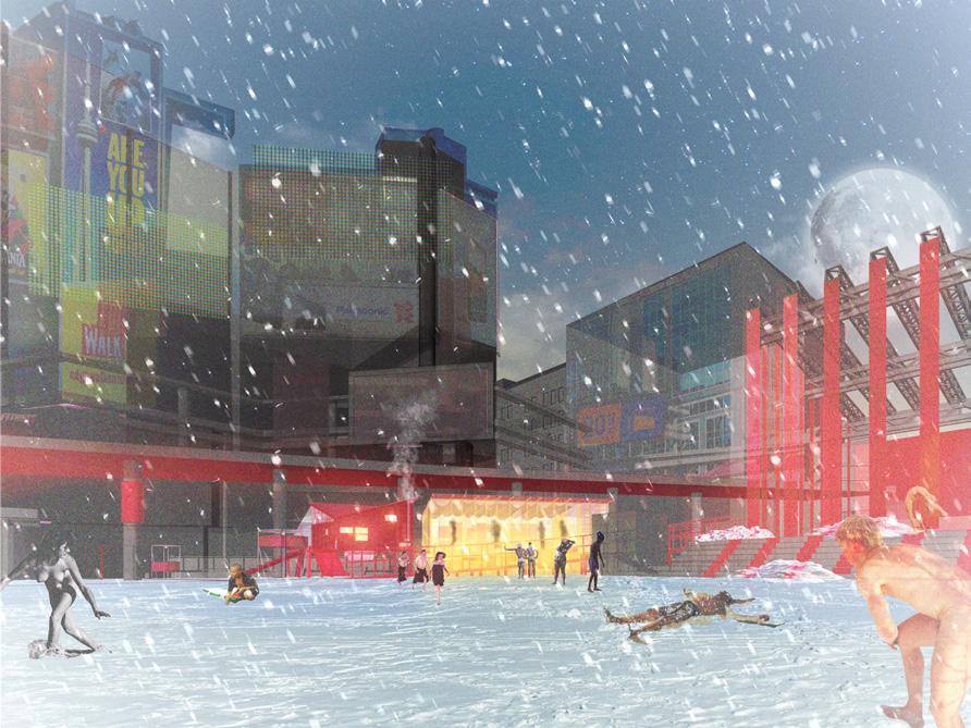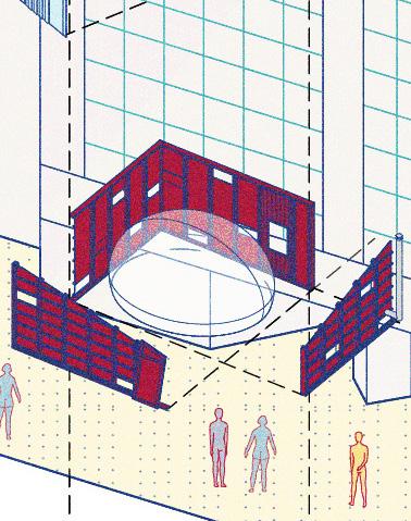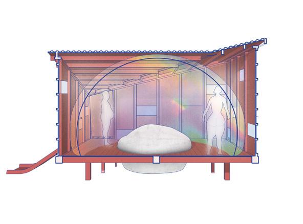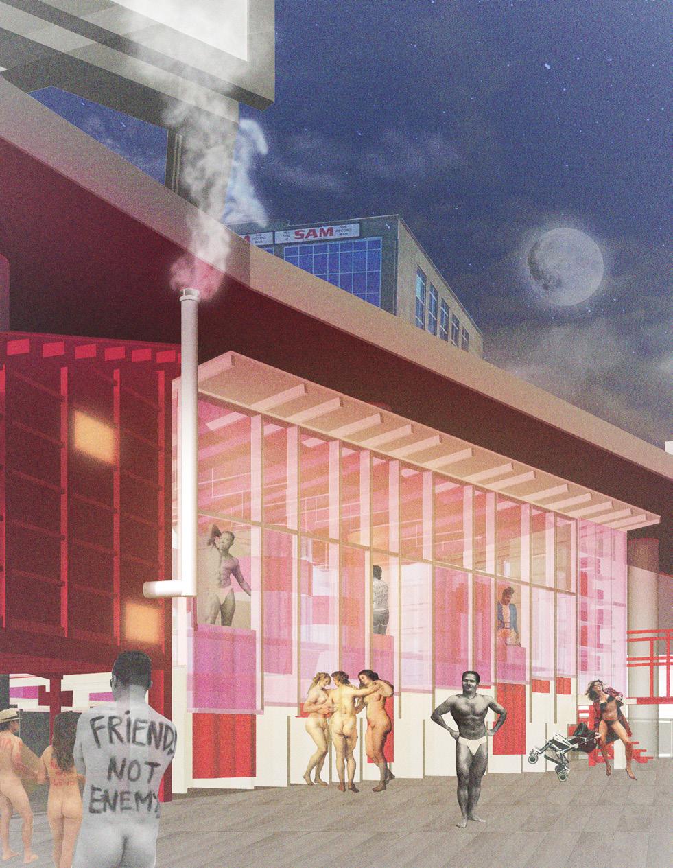 Next Year We March Naked is located in Sankofa Square (formerly Yonge-Dundas Square) and designed as a sister project with Erin Kim, whose design resides in Bellevue Square Park (is not featured). Sankofa Square today is frequented by commuters, shoppers, tourists, unhoused people, and visited by the annual Toronto Pride Parade. NEXT YEAR WE MARCH NAKED brings entirely new programming to the site, questioning what society defines as the public realm and what we allow to exist in it. The changeroom, sauna and stage element encourage occupation that challenges existing conditions and a veil that facilitates interaction.