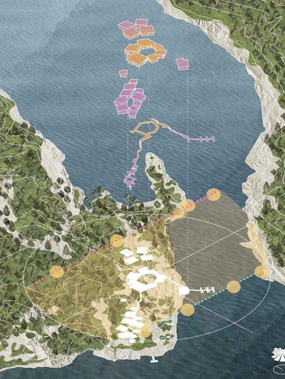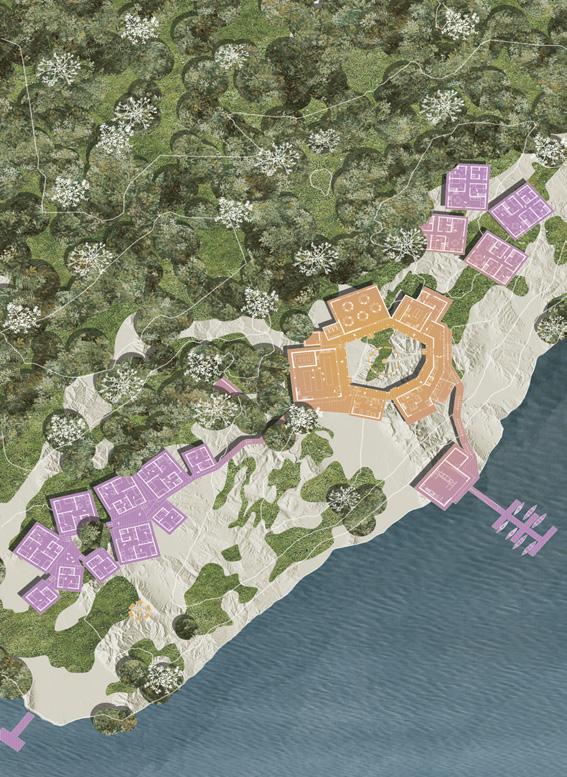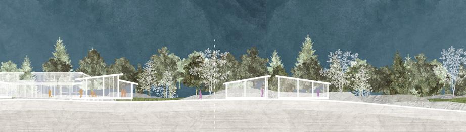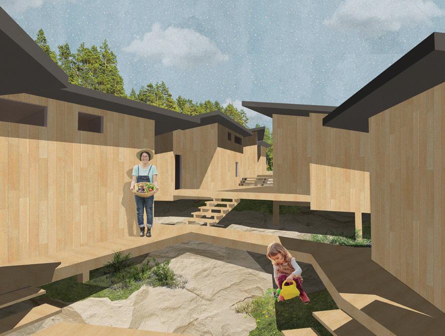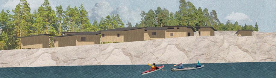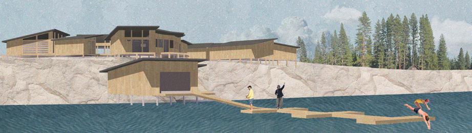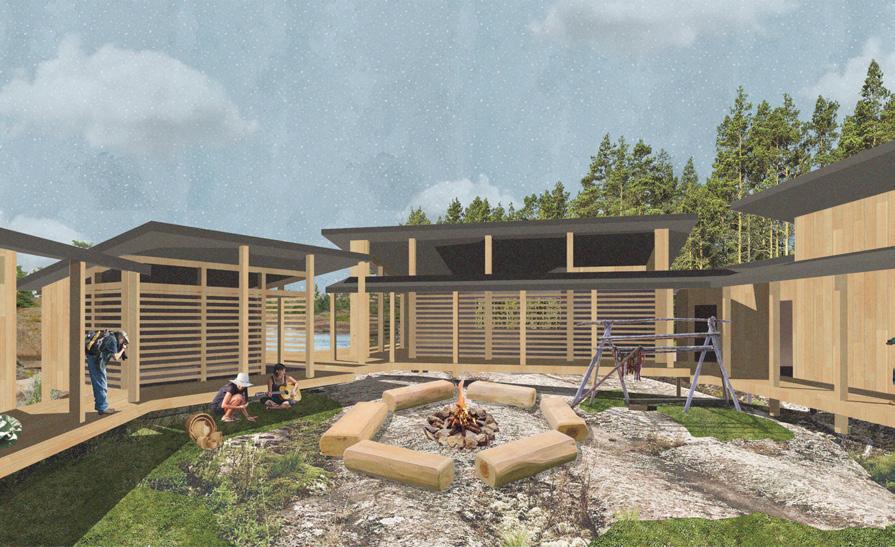 The Land Based Harvest Lodge is located in French River, Ontario, surrounded by beautiful forest and granite rock shaped by glacial formations . This project houses a land based harvest workshop intended as a summer camp for children and workshop for adults during fall and spring months. The main lodge is made up of 7 individual mass timber buildings, each with different programming that all contribute to the land based food harvest workshop. These individual buildings shift with the granite landscape and are tied together with a constructed walkway. This formation creates a courtyard that acts as the heart of the project, with a hearth sitting directly on granite. Altogether, the project shifts with the landscape and mimics the geometry of the granite.