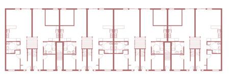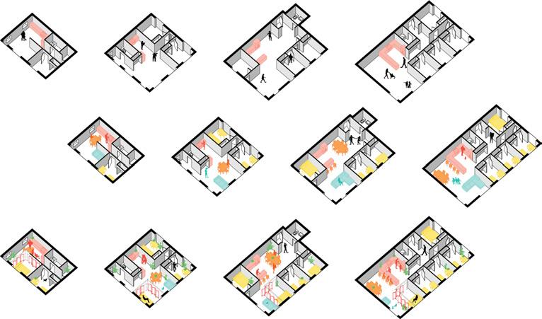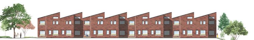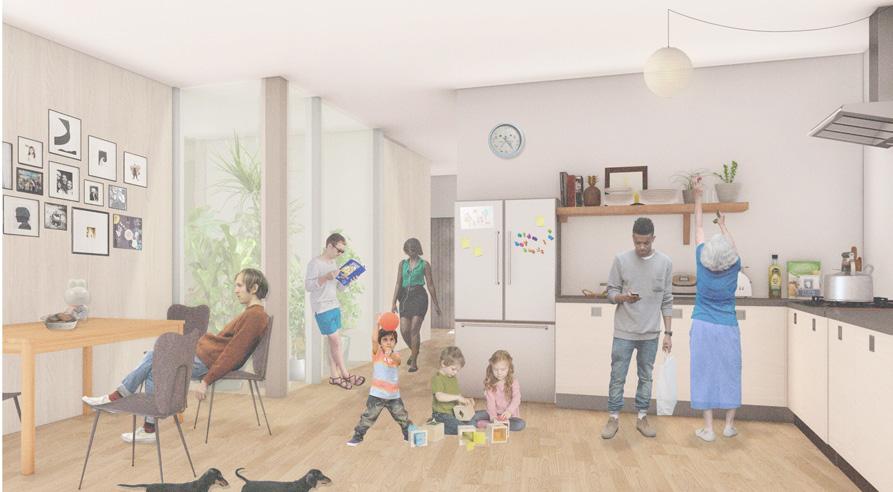 Communal row housing AKA CO-RO-HO feature a communal kitchen between potentially 4 different occupant groups. This housing is meant to accommodate all demographics with a barrier free ground floor and flexible occupancy.