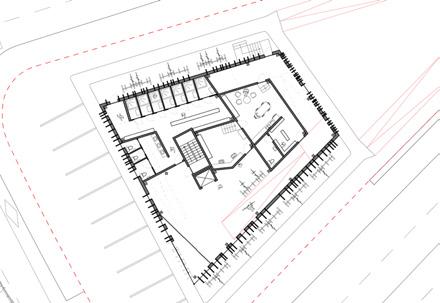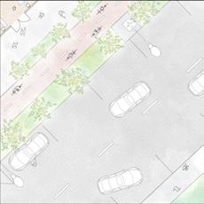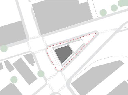 The exterior landscaping involves car parking, exterior bike racks, and a ramp that leads to the underground bike parking garage as well as the original bike path that is under the street.