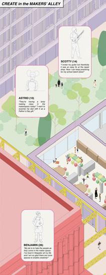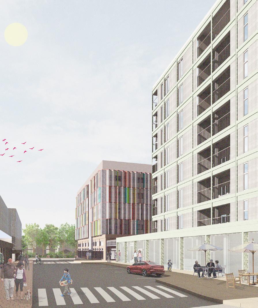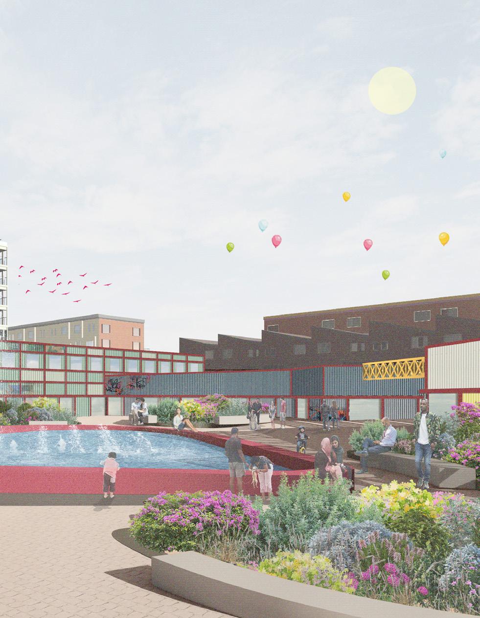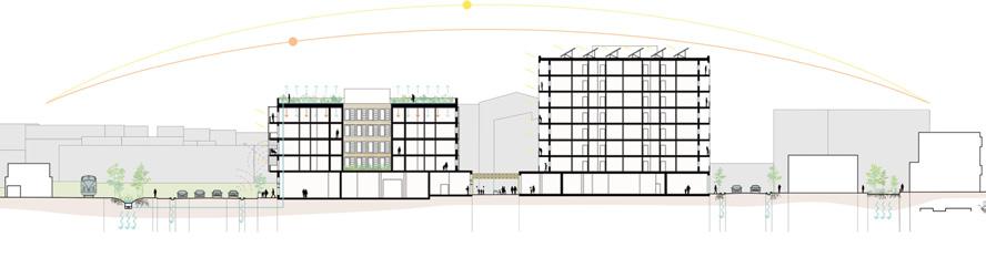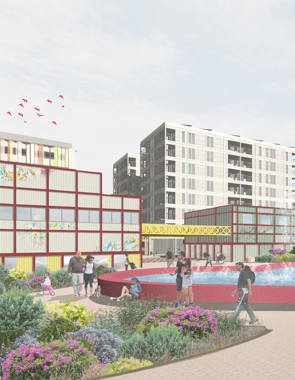 A circular economy of layered networks is created by maximizing both creative outlets to speak to the site’s industrial character, as well as a diverse set of green spaces heavily integrated into the residential fabric.