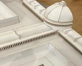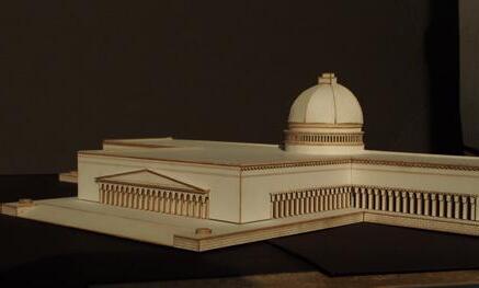 Arch 248 Cultural History Project to build a sectional model of Étienne-Louis Boullée’s Metropolitan Cathedral. From available drawings of the conceptual building, a digital 3D model was made and then converted to 2D lines to be laser cut out of white museum board. These pieces were assembled to create the final product. The immense scale and grandeur is built in this (approximate) 1:200 is built by layering multiple laser cut pieces to create depth and detail in the model.