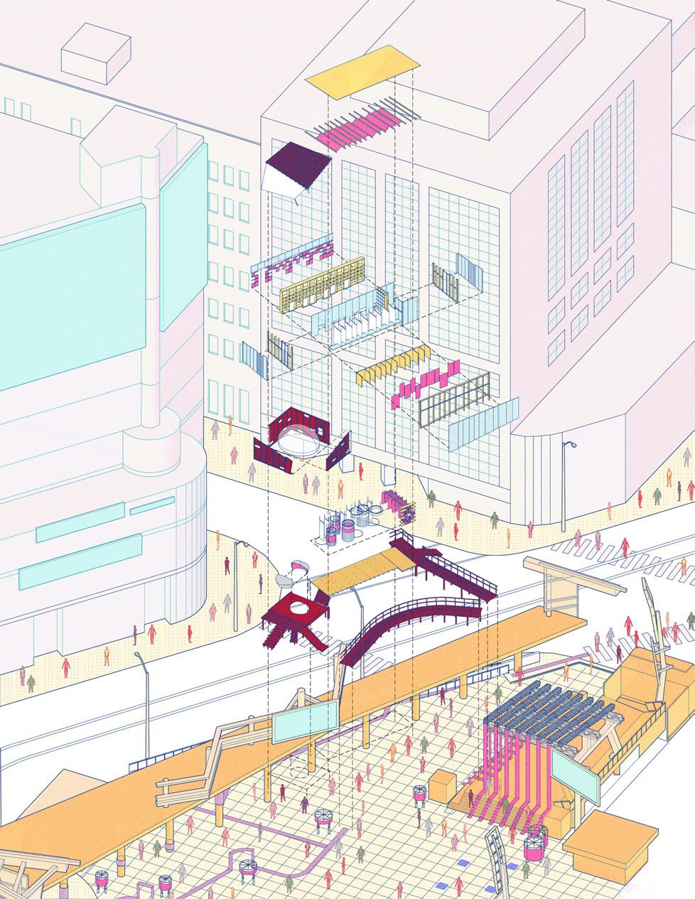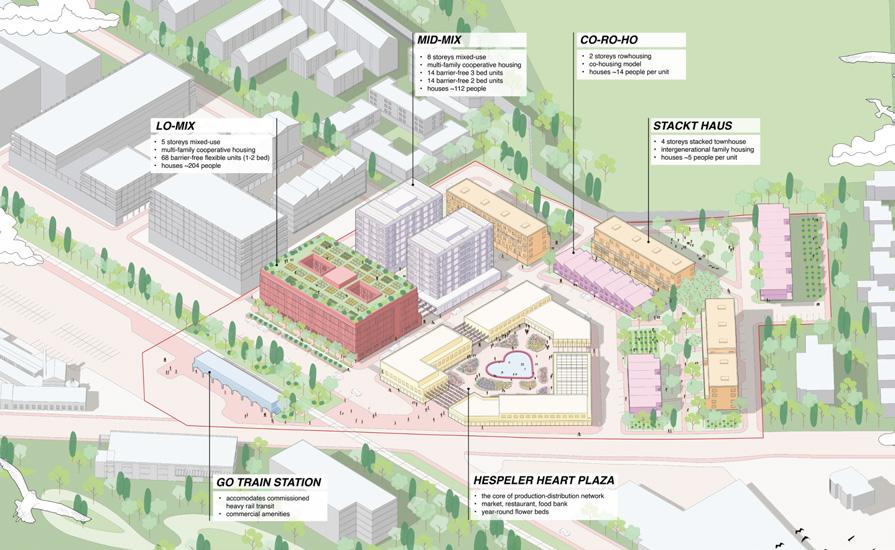 Situated on the historical and industrial lands, ‘Collectivize the Garden City!’ aims to improve housing alienation and food scarcity in the Hespeler area by utilizing the core tenets of a gentrification tax to imagine an urban strategy of connectivity; to not only maintain but also support the density of an urban space that accepts the influx of long-term residents brought in by the train station, the project incorporates various collective housing approaches to create intentional communities of greater support amongst residents.