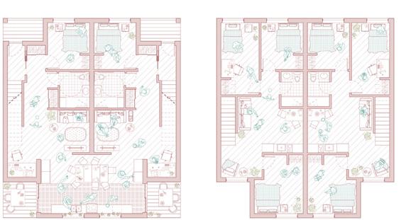 The MID-MIX housing consists of two 2 bedroom units and two 3 bedroom units that are designed to accommodate either single individuals or families.