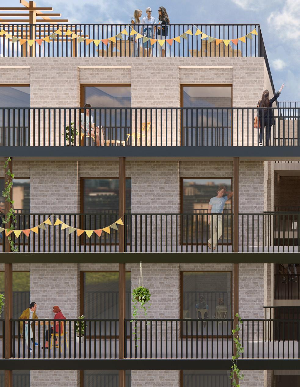 Units surround a communal kitchen space that includes shared laundry facilities and a balcony that faces Makers’ Alley.