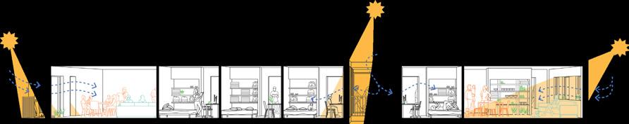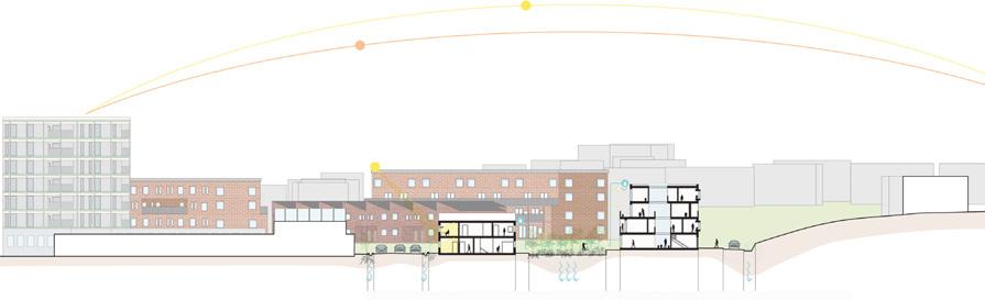 The Cambridge CoHousing design involves a strong focus on passive design. Light wells are integrated throughout the building between each unit to improve quality of light throughout each space. The south facing glazing and balconies are proportioned to each other in order to maximize heat gain from the sun during the winter months, and shading in summer months.