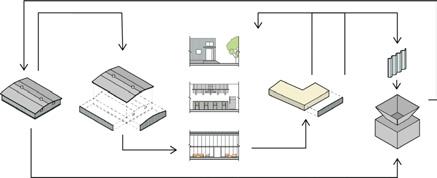 The diagram above maps local building material suppliers in Cambridge measured in sections of 5km. Special materials such as CLT will be supplied off site. Below are life cycle diagrams of materials used, reused, and manufactured on site.