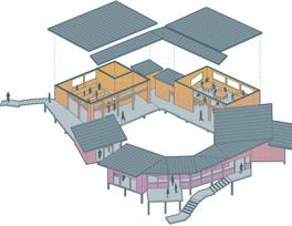 The programs located in the main lodge include dining, preparation / cooking, reception, lounge, library. Within and near the courtyard you can find a smokehouse, drying rack and storage room. The programming in the main lodge supports ideas to live lightly on the land, in which visitors get to participate in minobimaatisiiwin - a way of living - instead of Traditional Ecological Knowledge.