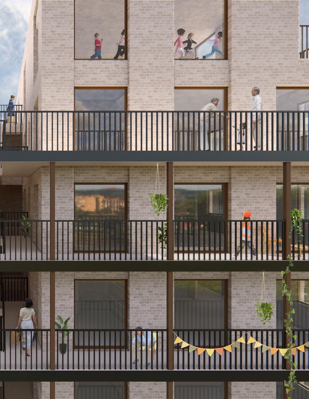 The LOW MIX housing units surround courtyards framed by a partially enclosed balcony. Units are mirrored with flexible partitions built in consultation with occupants for agency and adaptability. Laundry facilities are provided in a communal space, and lighting is diffused with the use of operable shading throughout the building’s facade.