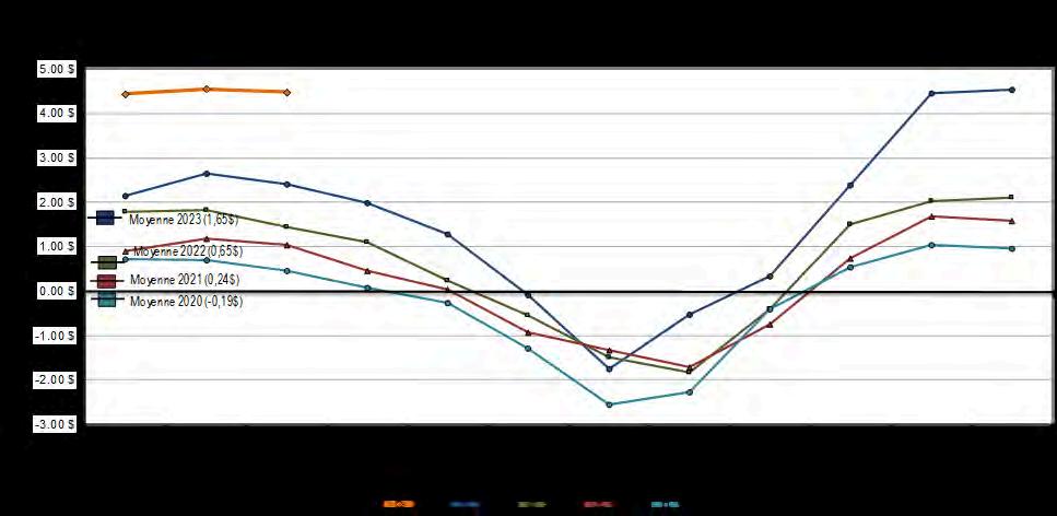 Effectivement, comme on peut le voir dans le graphique suivant, on peut constater l’impact de cette variation saisonnière en comparant le prix net payé aux producteurs selon les deux méthodes de calcul mentionnées.