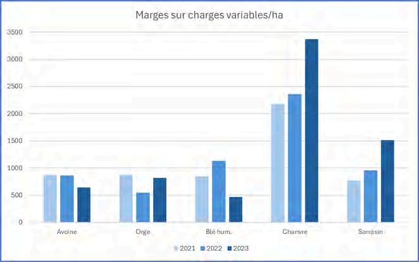 Nous pouvons donc remarquer que le chanvre et le sarrasin ont dégagé la meilleure marge en 2023, une année où les rendements ont par ailleurs été supérieurs à ceux de 2022. Pour les céréales à paille comme l’avoine, le blé et l’orge, les rendements n’ont cessé de diminuer entre 2021 et 2023 commecefutaussilecaspourlescéréalesconventionnellesenrégionaucoursdelamêmepériode. Cette baisse de rendements jumelée à la diminution des prix de vente a contribué à réduire les marges pour ces céréales. Il va sans dire que le plan de rotation pour les prochaines années pourra changerselonlesrésultatspersonnelsdechacun!
