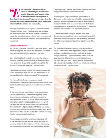 “We’ve been coming to Jamaica from I was two years old. This is home for my mom and dad and they wanted us to come and see where they were raised,” she explained. Her mom, a British Airways employee, enjoyed complimentary travel, which afforded the family annual trips that fostered the strong bond Lorraine developed with the island. Of the memories she cherished on those annual visits, Lorraine says gleefully, “I remember us getting to the airport, hoping and keeping our fingers crossed that there was a seat for all of us on the plane. Then landing in Kingston was always special, because, as you got off the plane you got that heat and then that natural smell. Because I didn’t eat plane food, our first stop was always KFC, then getting to my aunt and it was always night when we arrived so there was the sound of the crickets and bugs. That for me meant that I was home.” Those prized moments for Loraine were trumped only by the late night chatting with her Jamaican family and spending time with the neighbours. “In the morning my neighbour would come to the bathroom window and ask CIJ FALL 2018 29