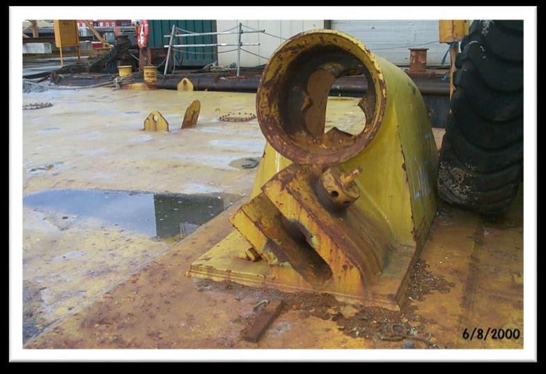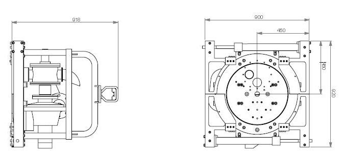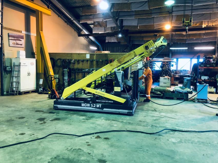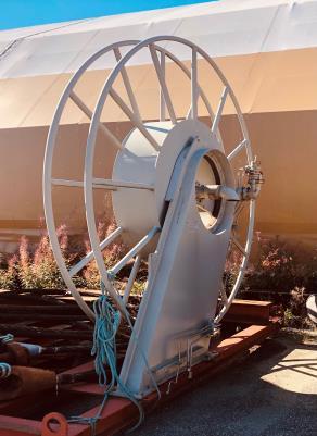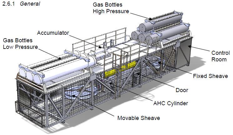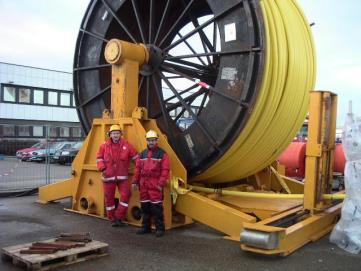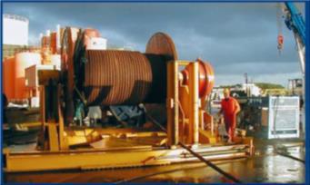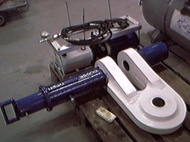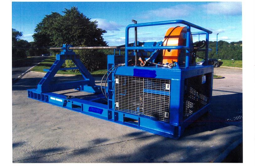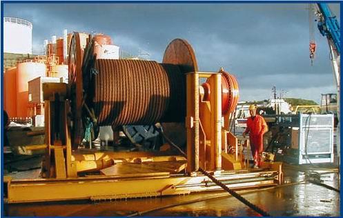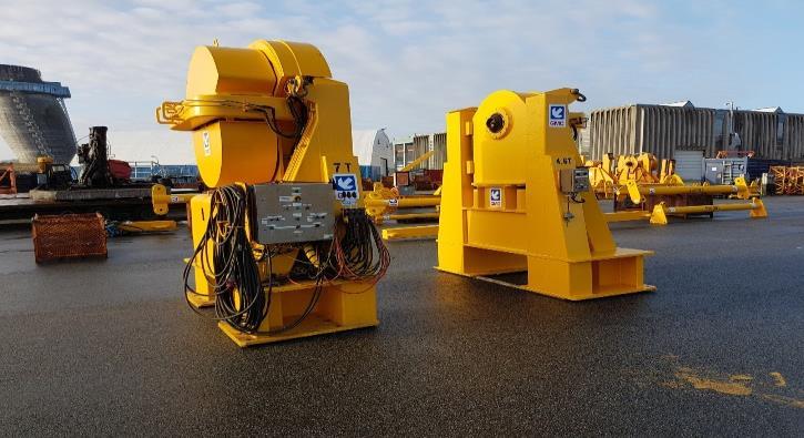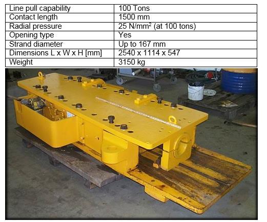 Our gripper machines (2 off) are special designed to hold wire or sheathed spiral strand up to 167 mm diameter. The length and shape of the interchangeable inserts are calculated and designed to limit the radial pressure to 25 N/mm2 (3550 psi). The inserts have a smooth surface and a large radius. Wire or cable can be removed by the top (by opening the gripper) with easy handling, but cable socket will not be able to pass through the gripper. The machine can act as a linear winch in conjunction with deck winch.