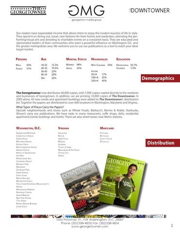 The Georgetowner now distributes 40,000 copies, with 7,000 copies mailed directly to the residents and businesses of Georgetown. In addition, we are printing 10,000 copies of The Downtowner. In 2005 alone, 45 new condo and apartment buildings were added to The Downtowner’s distribution list. Together the papers are distributed to over 600 locations in Washington, Maryland and Virginia . What Types of Places Carry the Papers? Upscale neighborhoods and stores such as Whole Foods, Balducci’s, Barnes & Noble, Starbucks, Olsson’s carry our publications. We have racks in many restaurants, coffe shops, delis, residential apartment/condo buildings and hotels. There are also street boxes near Metro stations.