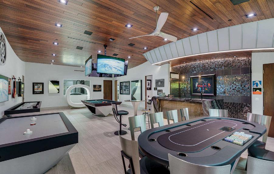 And that’s just the beginning of the surprises that this home has in store. There’s also a fi tness room, a casino-inspired man cave (with a wet bar, pool table, professional Texas Hold’em table, shu eboard and air hockey table), a 13-seat movie theater and media room with a 22-foot screen, wine cellar, basketball court, two-story rock-climbing wall and a dog spa with motorized dog doors and bathing area. In the center of the home you’ll fi nd a custom glass elevator.