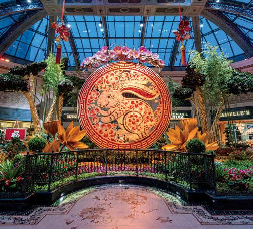 The meal comes with an incomparable view of the 32-foot-tall Year of the Water Rabbit sculpted medallion in the West Bed (the hero piece of the display sentried by twin bonsai trees) that reflects the rippling waters beneath it at night. Intricately crafted cloisonné cherry blossoms hang above fu dogs that watch over the surroundings. A 17-foottall statue of Chinese god of wealth Caishen in the east bed gazes in the direction of Bellagio’s entrance, while a nearby family of golden rabbits gather on a wooden bridge. Family, food, fun … what Lunar New Year is all about.