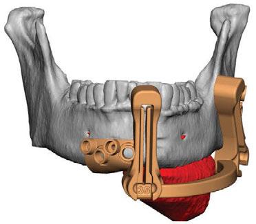 The software helps plan cuts through the mandible bone and fibula, and a custom plate is designed to fixate the fibula bone piece to the native mandible.