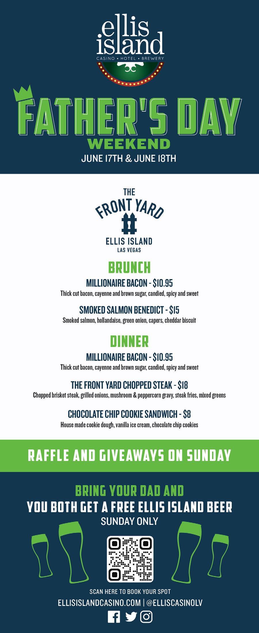 IT’S THE SUMMER OF RED, WHITE AND BLUE PANCAKES. © 2023 DFO, LLC. Printed in the U.S.A. At participating restaurants for limited time only. Selection and prices may vary. While supplies last. Celebrate Father’s Day with luxury in mind. Treat the superhero in your life to some of Tivoli Village’s most exclusive restaurants, signature health experiences and premier retailers. FATHER’S DAY GIVEAWAY SCAN FOR MORE INFORMATION LAS VEGAS PAIUTE/SNOW MOUNTAIN SMOKE SHOP PER CARTON* (CIGARETTES ONLY) $2 OFF *Must be 21 years of age or older. Excludes filtered cigars. Cannot be combined with other offers or discounts. Limit 1 discount given per customer per day. Must present this coupon for redemption. Cannot be redeemed for cash. No photocopies accepted. EXPIRES 6/30/2023. LVW LAS VEGAS PAIUTE CIGAR SHOPPE/SNOW MOUNTAIN SMOKE SHOP *Cannot be combined with any other offers or discounts. Must be 21 years of age or older. Excludes sampler packs. Excludes bundles & individual sticks from bundles, cigarettes, mass market and pipe tobacco. Must present this coupon for redemption. Not valid on alcohol purchases. Cannot be redeemed for cash. No photocopies or digital copies accepted. Expires 6/30/2023. LVW Las Vegas Paiute Tribal Smoke Shop & Cigar Shoppe M-Sat 7AM-7PM • Sun 8AM-5:30PM 1225 N. Main St. Las Vegas, 89101 Snow Mountain Smoke Shop & Gas Station M-Sun 6AM-7PM • Pay-At-The-Pump Open 24/7 US 95N @ Exit #99 NEVER PAY ADDITIONAL TAX! - GO TO LVPAIUTESMOKESHOP.COM FOR COUPONS $38.99* FINAL PRICE WITH COUPON $4.29 per pack PREMIUM CIGARS & ACCESSORIES 15% OFF $83.79* FINAL PRICE WITH COUPON $8.59 per pack