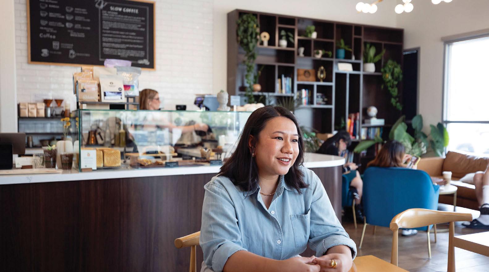 Lovely Mempin, co-owner and creative director of Evergreen Co ee, chats at the shop’s Henderson location.
