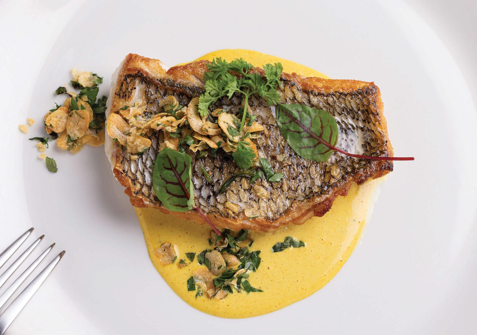 pomegranate, and crispy-skin chicken Brasserie, served with green olives and piquillo pepper relish; and seafood like slow-roasted salmon with honey mustard horseradish, Dover sole with wild mushrooms, and black bass with fresh herbs de Provence, pictured.