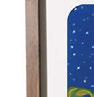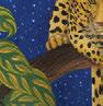 On the right-hand wall hangs Jesus Gonzalez’s “Yagé” (2025), a 24-by-18-inch soft pastel work that hums with feral color. The jaguar, muscled and alert beneath a starpricked sky, is less predator and more of a protector. In Indigenous cosmologies, yagé (more widely known as ayahuasca) is a plant of medicine, a spiritual detonator, and Gonzalez roots his composition in that lineage. The feline serves as the guardian of the sacred vine. It stands at the center of the living system, in this case centered in the riotous foliage of electric blues and