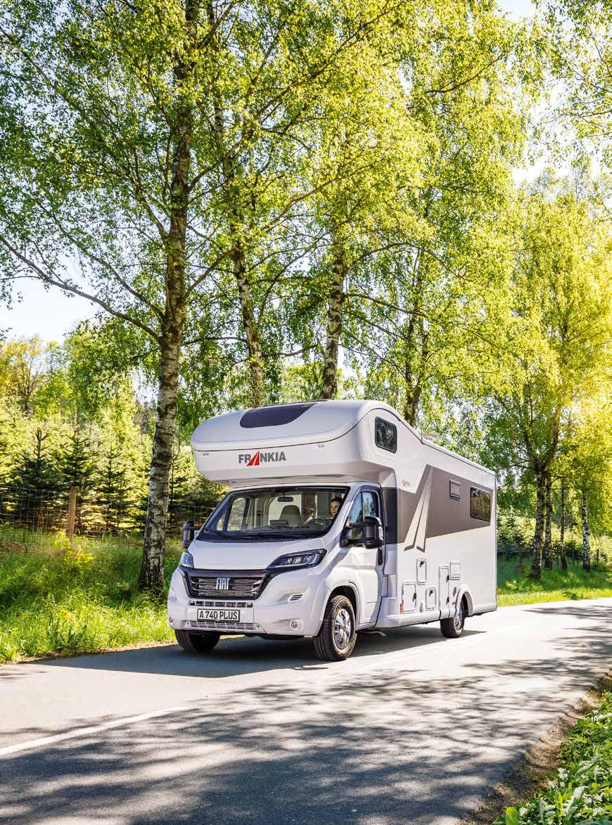 Die FRANKIA F-Line überzeugt mit faszinierenden Aufbaumöglichkeiten, die nur eine Fiat Ducato-Basis in Kombination mit einem AL-KO Tiefrahmen bietet. Integriert oder Alkoven, kompaktes Unikat oder Luxusliner – Sie haben die Wahl aus sechs besonderen Grundrissen mit 6,5 bis 7,5 m Länge.