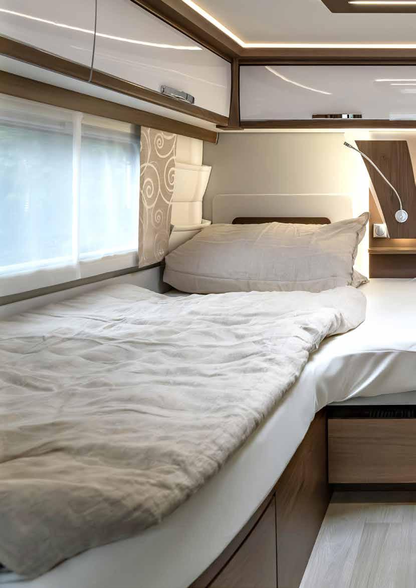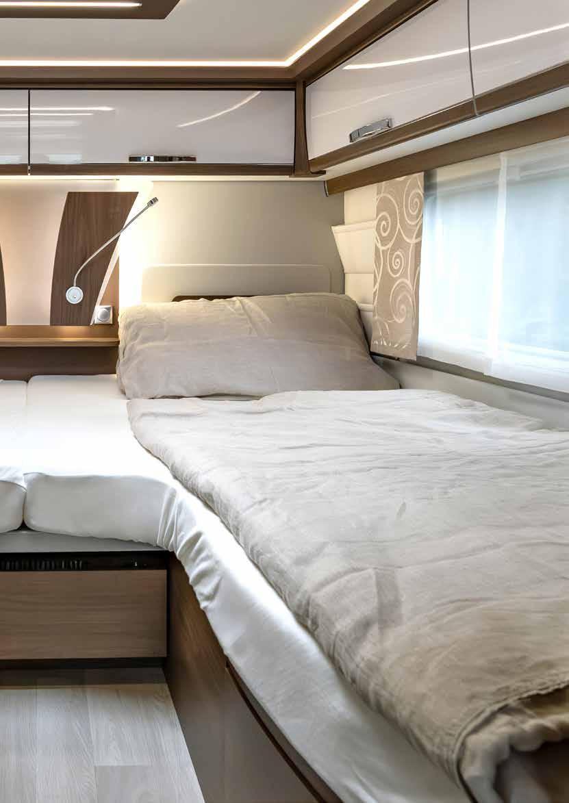 Genau das können Sie in den Schlafzimmern der FRANKIA F-Line. Egal wie, wann und ob Sie schlafen möchten. Hier ist alles möglich – in komfortablen Längsbetten, im großartigen Hubbett oder im geräumigen Alkoven.