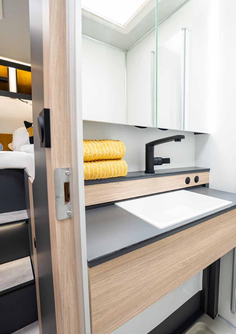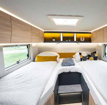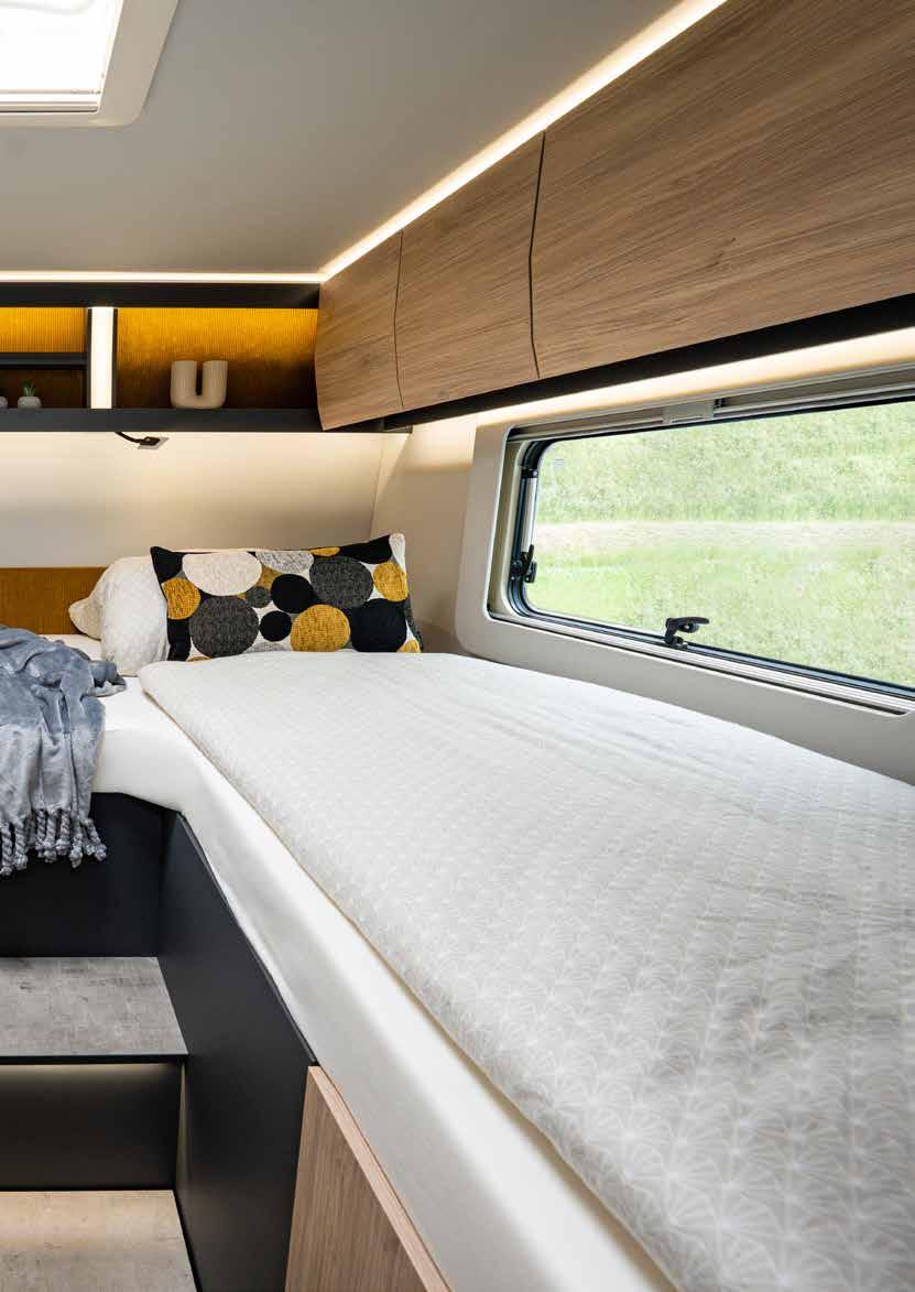 Eigentlich sind die getrennten Längsbetten oder das Querbett im Heck zum Schlafen viel zu schade … denn bei Wellenrauschen und Vogelgezwitscher lässt es sich auch den ganzen Tag im Bett verweilen. Passend dazu präsentiert sich der NEO MT in drei farbigen Styles, während der NEO MI BLACK LINE nordisch-frisch und reduziert auftritt.