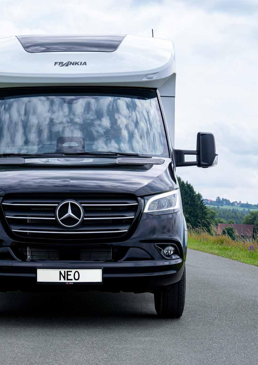Der FRANKIA NEO weiß, wo es langgeht: Deshalb setzt er auf innovativen Leichtbau mit 3,5 oder 4,5 t Gesamtgewicht* auf einer wendigen Länge von 7 m. Starke Basis: der Sprinter von Mercedes-Benz mit Frontantrieb.