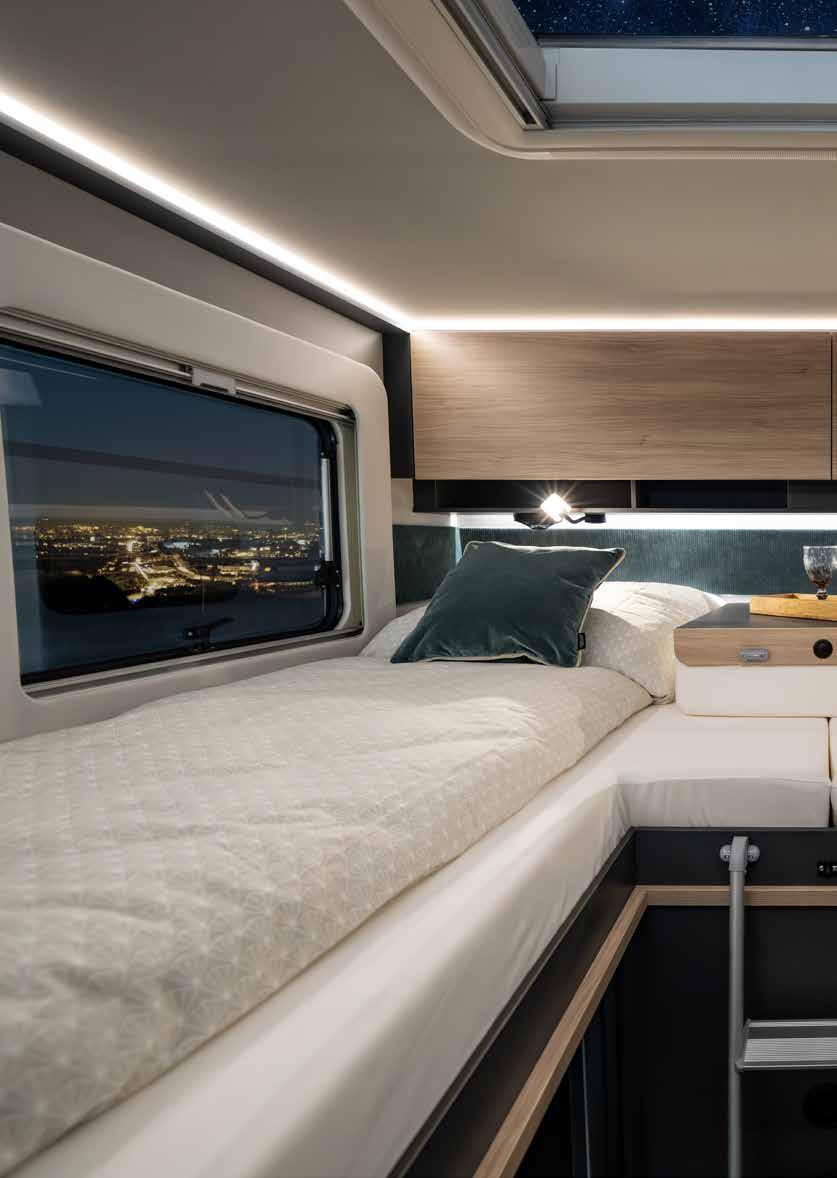 NOW gibt dir ein neues Gefühl für Raum! Denn er verzichtet auf klobige Bordkästen, Fenstergardinen, Trittstufen – und setzt stattdessen auf jede Menge Freiraum, 2,13 m Stehhöhe und eine große Garage. Raum schenkt er dir auch, um Kids und Freunde mitzunehmen –dank des elektrischen Hubbetts.