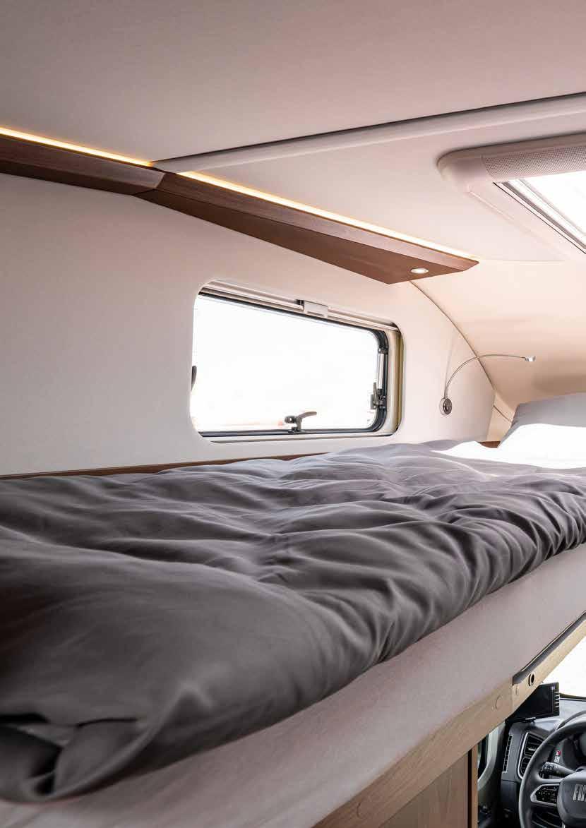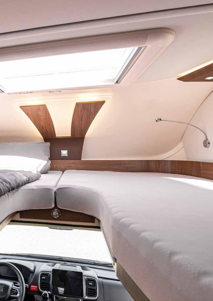 Schlafen im Alkoven des TOGETHER? Ein Traum. Denn der FRANKIA-Alkoven ist ein ganz Besonderer: Längseinzelbetten mit jeweils etwa 2 m Länge und extra viel Platz rundherum versprechen angenehme Nächte. Ein großes Heki sowie zwei Seitenfenster, dimmbare Ambientebeleuchtung und Leseleuchten machen die Stimmung perfekt.