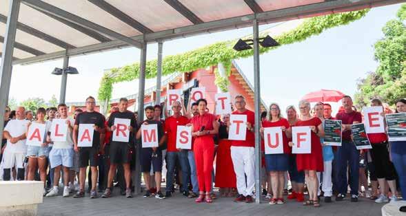 Rund 100 Mitarbeiterinnen und Mitarbeiter des Bezirkskrankenhauses zeigten während der Aktion mit der Signalfarbe Rot, wie wichtig sie und ihre Arbeit für die Gesellschaft sind. Die Forderung: Weg mit der Bürokratie, weg mit starren Vorgaben zu Personalbesetzungen und mehr Geld ins System. Die Bundesregierung müsse jetzt handeln und dringend einen Inflationsausgleich für die Krankenhäuser auf den Weg bringen. Ansonsten zwinge sie die Krankenhäuser zu flächendeckendem Personalabbau, der zu einem Abbau der Patientenbehandlung führt. „Die Zeit bis zu einer sinnvollen wohlüberlegten Reform haben wir nicht“, sagt Katja Bittner.